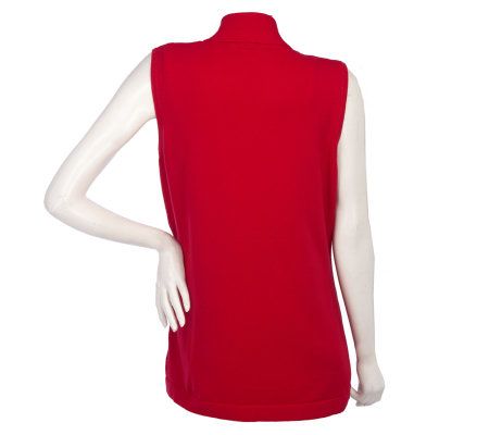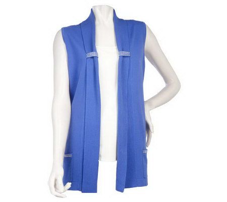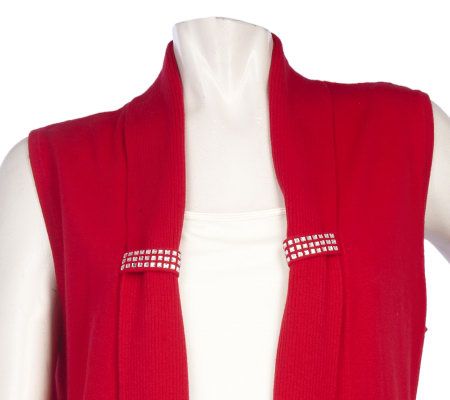 Wrap yourself in the warmth and luxury of this shimmering sweater vest. Sparkling rhinestone trim along the shawl collar adds a dazzling accent--perfect for the office or out to dinner with friends. From Quacker Factory(R).