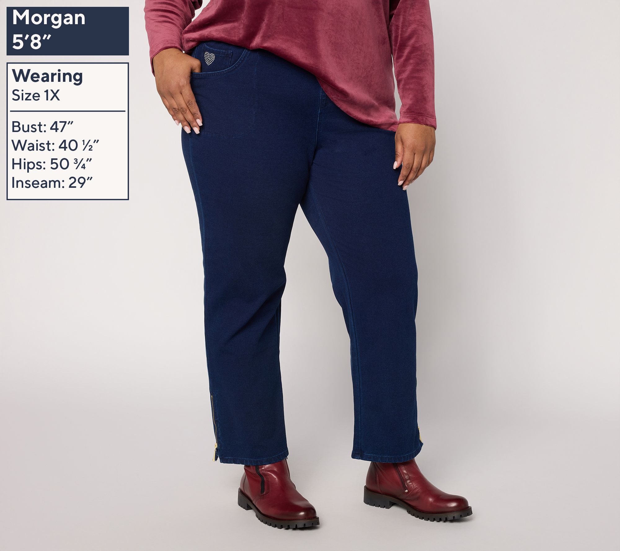 Features: pull-on style, ankle length, side pockets, zipper detail at hem, rhinestone heart at pocket