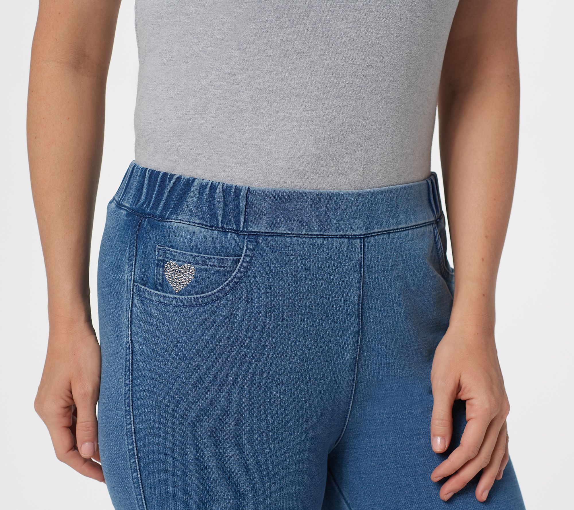 With the look of denim and the feel of your most comfy yoga wear, these DreamJeannes pull-on pants will rise to the top of your must-have list. Edged with fringe for a fantastic finish, the crop length makes a sweet style solution for those not-too-warm, not-too-cold kinda days. From Quacker Factory®.