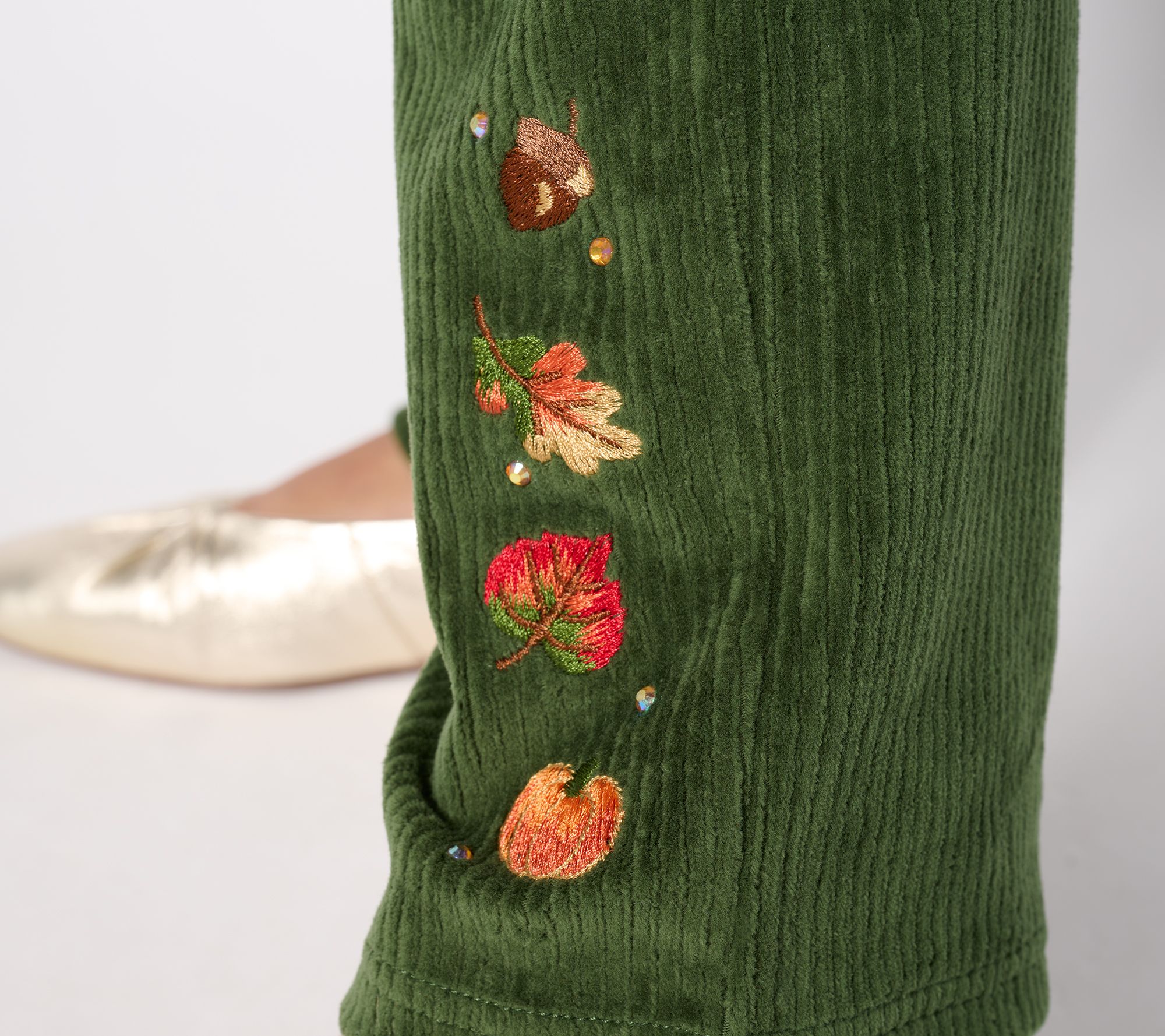 This season, let your heart be light (and your days be comfy!) in these refined stretch corduroy pants with a charming fall motif. From Quacker Factory®.