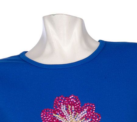 Fashionable fun--all summer long. This short-sleeved T-shirt heats up your wardrobe with a sparkling sequin-accented tropical motif on the front. From Quacker Factory.