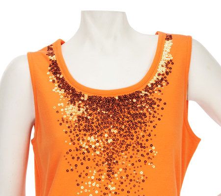 Liven up any casual outing with this snazzy tank top. Embellished with shiny sequins on the chest, it's a great way to make a memorable entrance. From Quacker Factory.