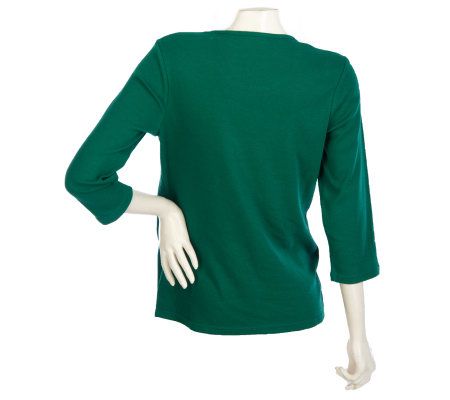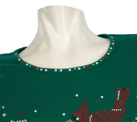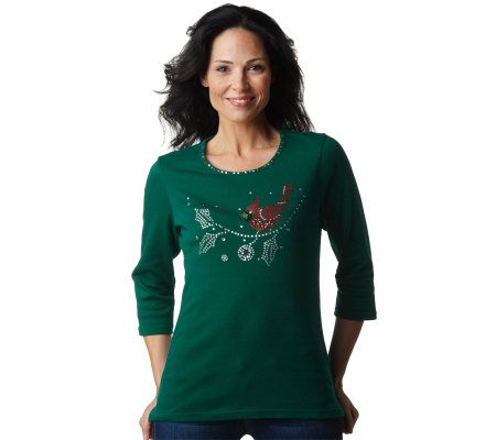 Welcome winter. Designed with 3/4-length sleeves and a rhinestone-trimmed neckline, this T-shirt is detailed with a cheery cardinal rhinestone design on the front. From Quacker Factory.