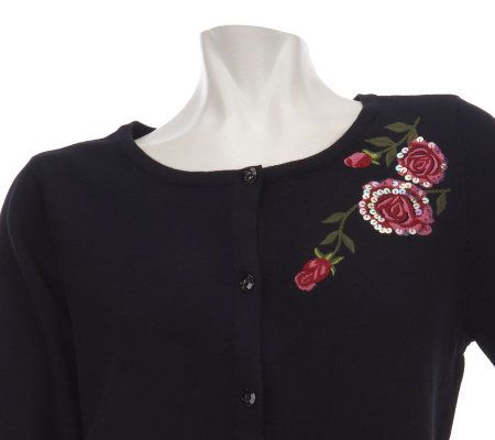 Capturing the classic beauty of a garden in bloom, this cardigan sparkles with an embroidered and sequin rose design and gleaming rhinestone buttons. From Quacker Factory.