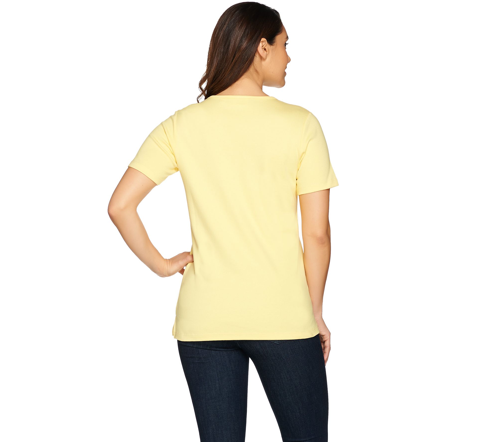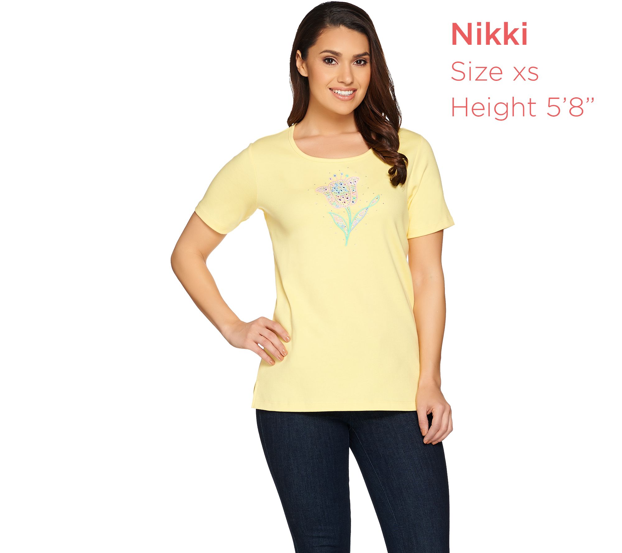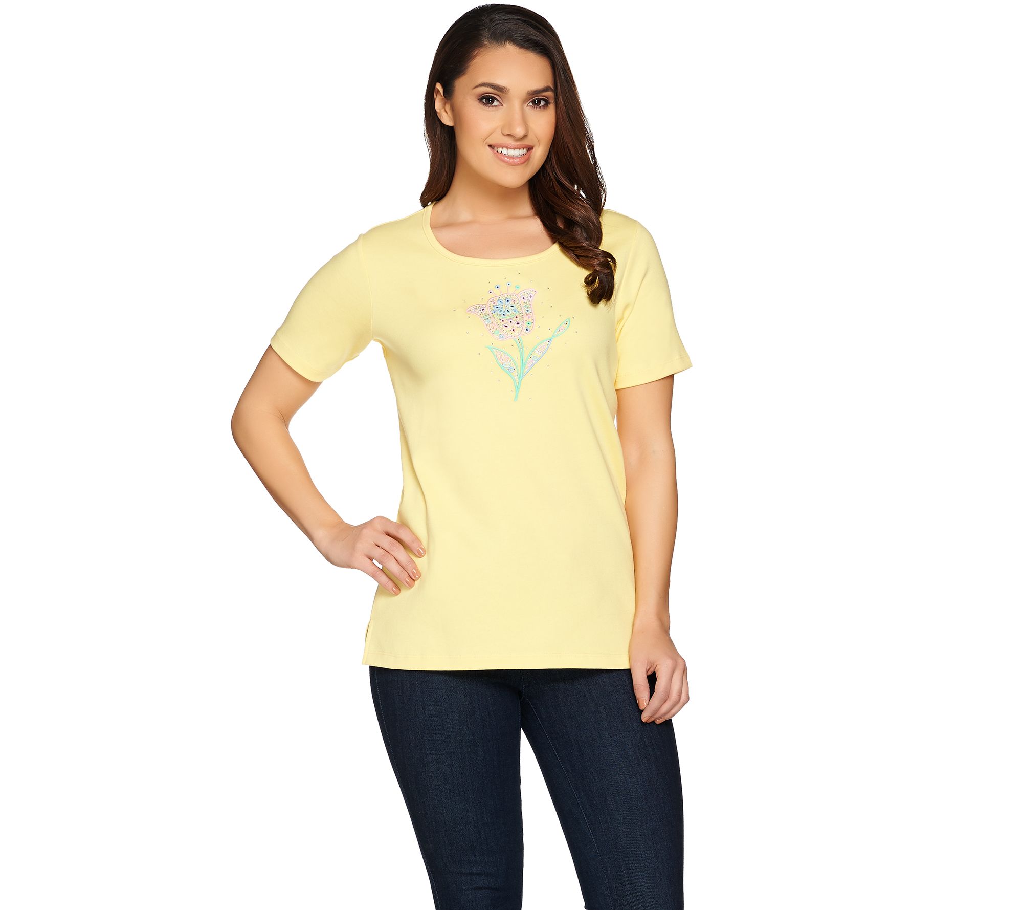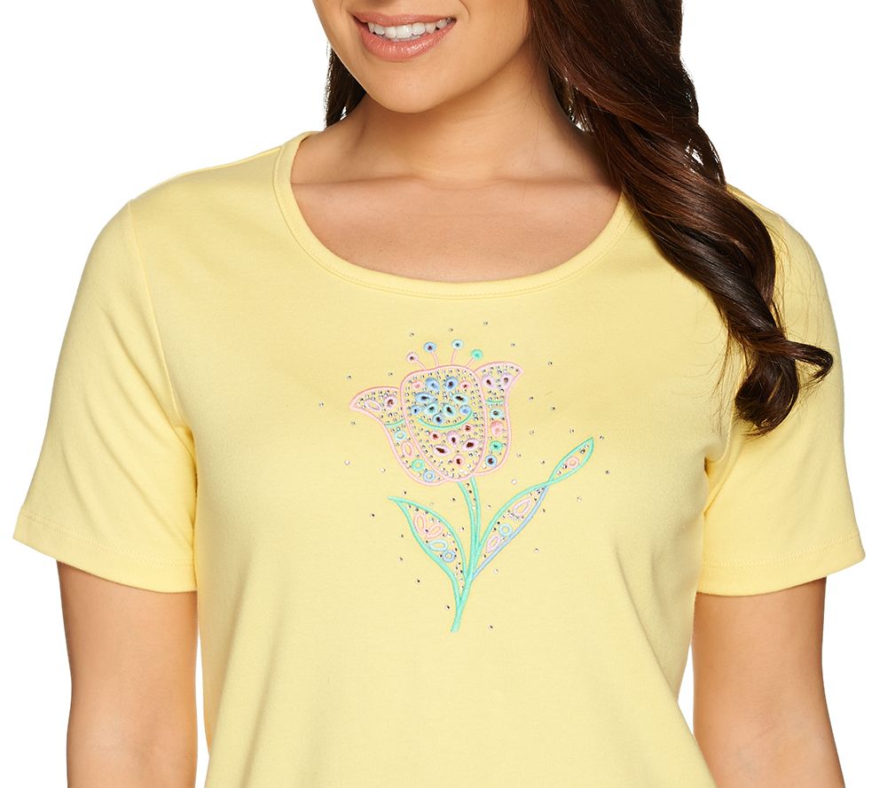 With bright days ahead, you'll want to wake up your wardrobe with some Quacker Factory style! This spring-themed T-shirt is a harbinger of the season with its embroidered motif and rhinestone accents. From Quacker Factory.