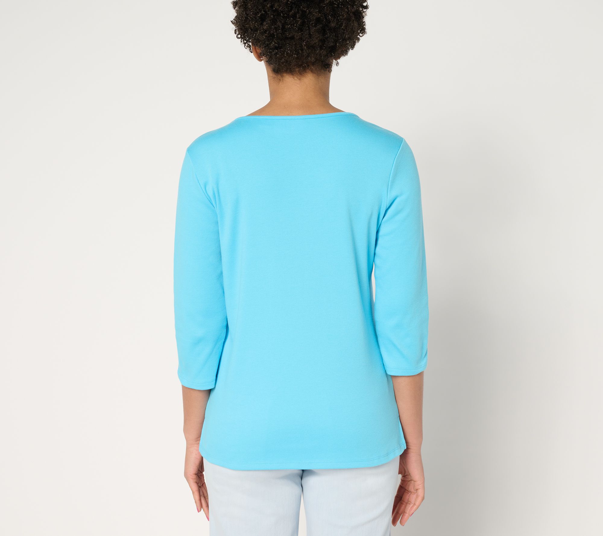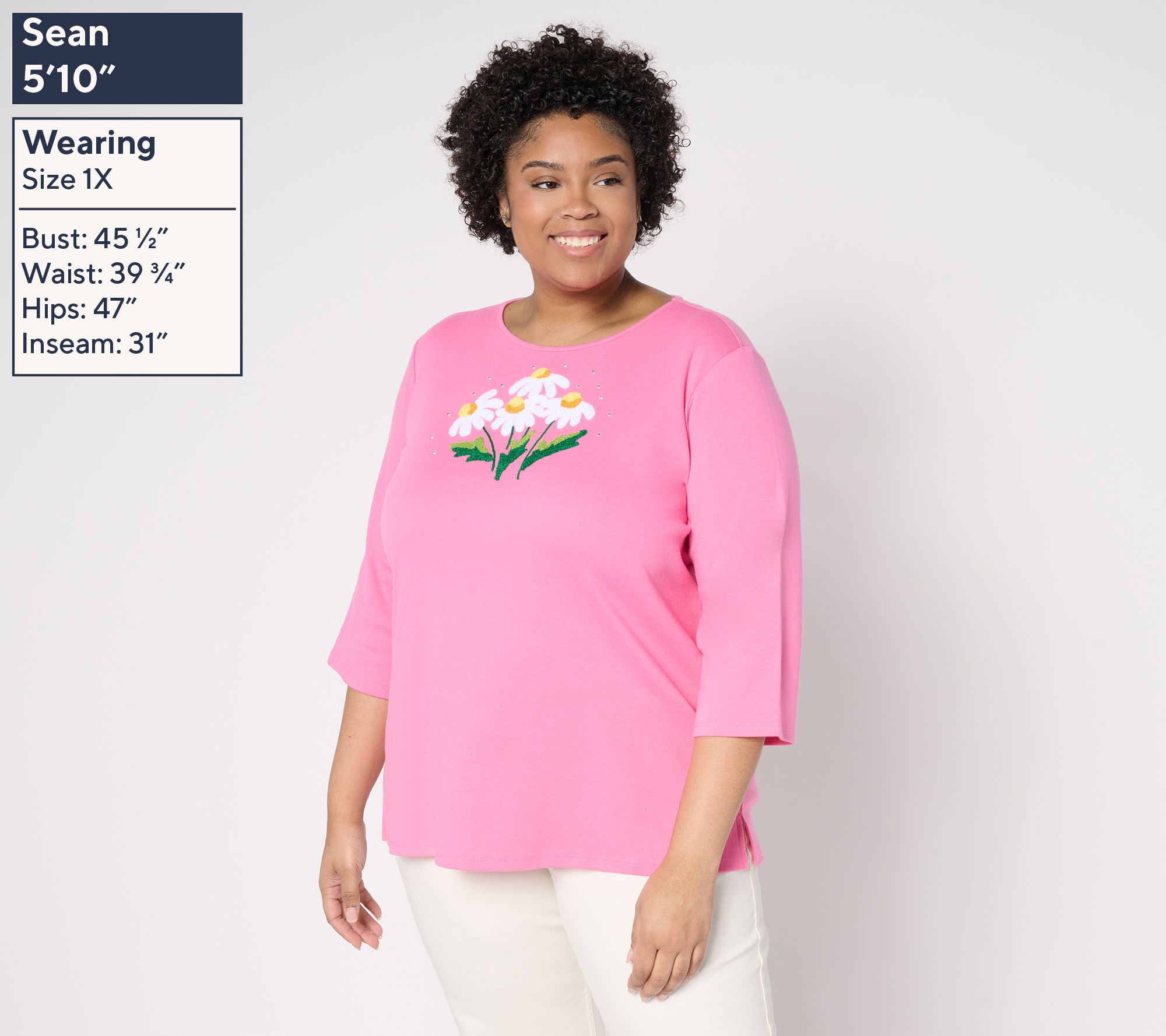 Features: springtime punch-needle daisy design with embellishment, 3/4-length sleeves, round neck, straight bottom hem, side slits