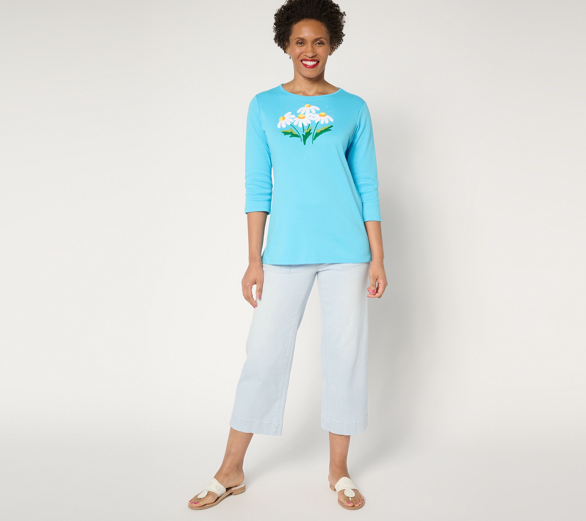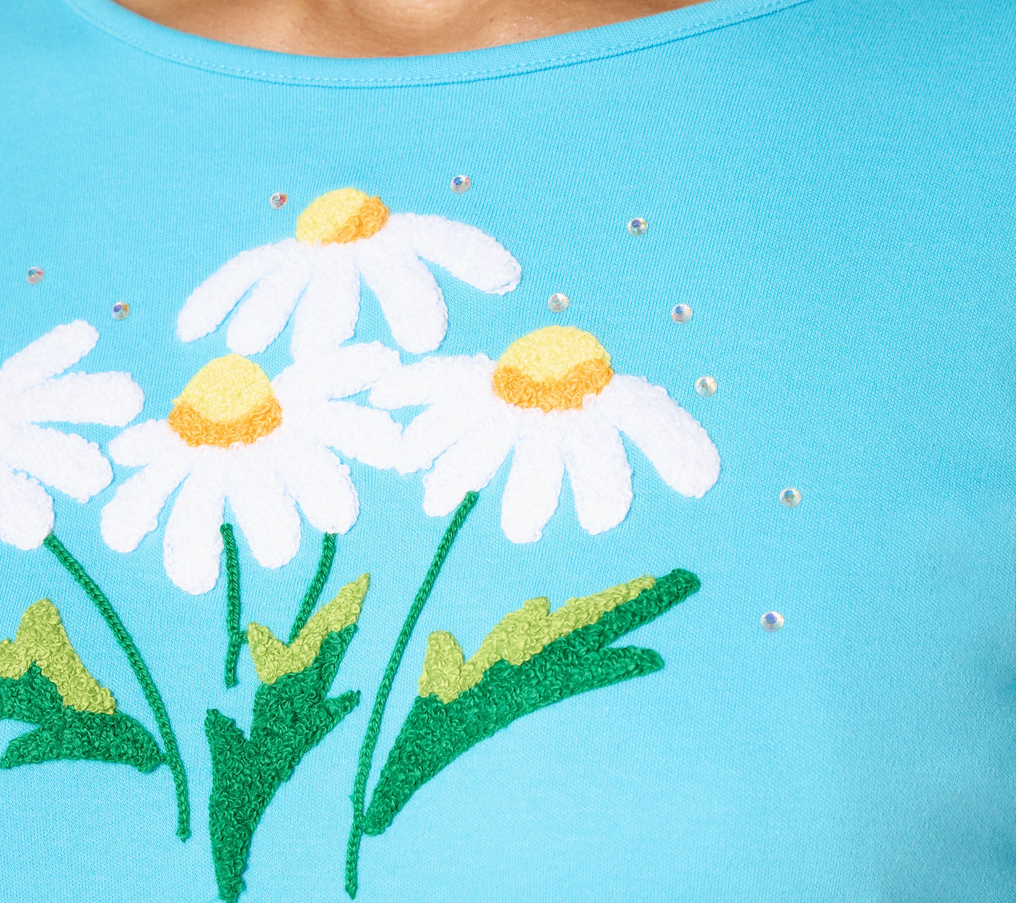 Flower, empowered! Be responsible for smiles on the faces of friends and family, your students, or even strangers in this springy top with a punch-needle daisy design. From Quacker Factory®.