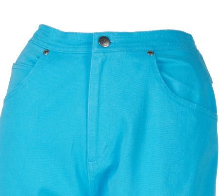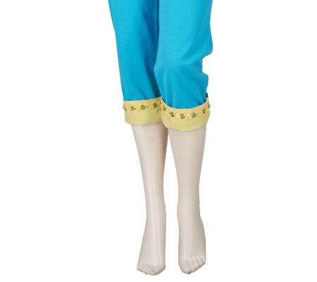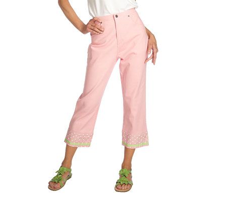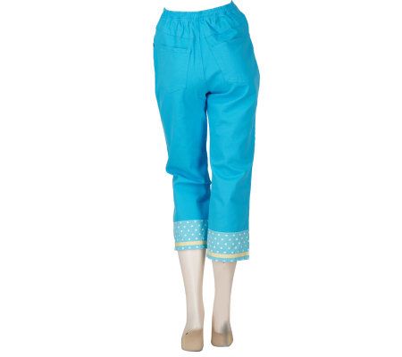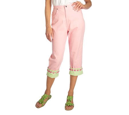 Beauty where you least expect it. These denim crop pants have an adorable reversible cuff at the hem. One side has plucky polka dots and the other features a floral design. From Quacker Factory.