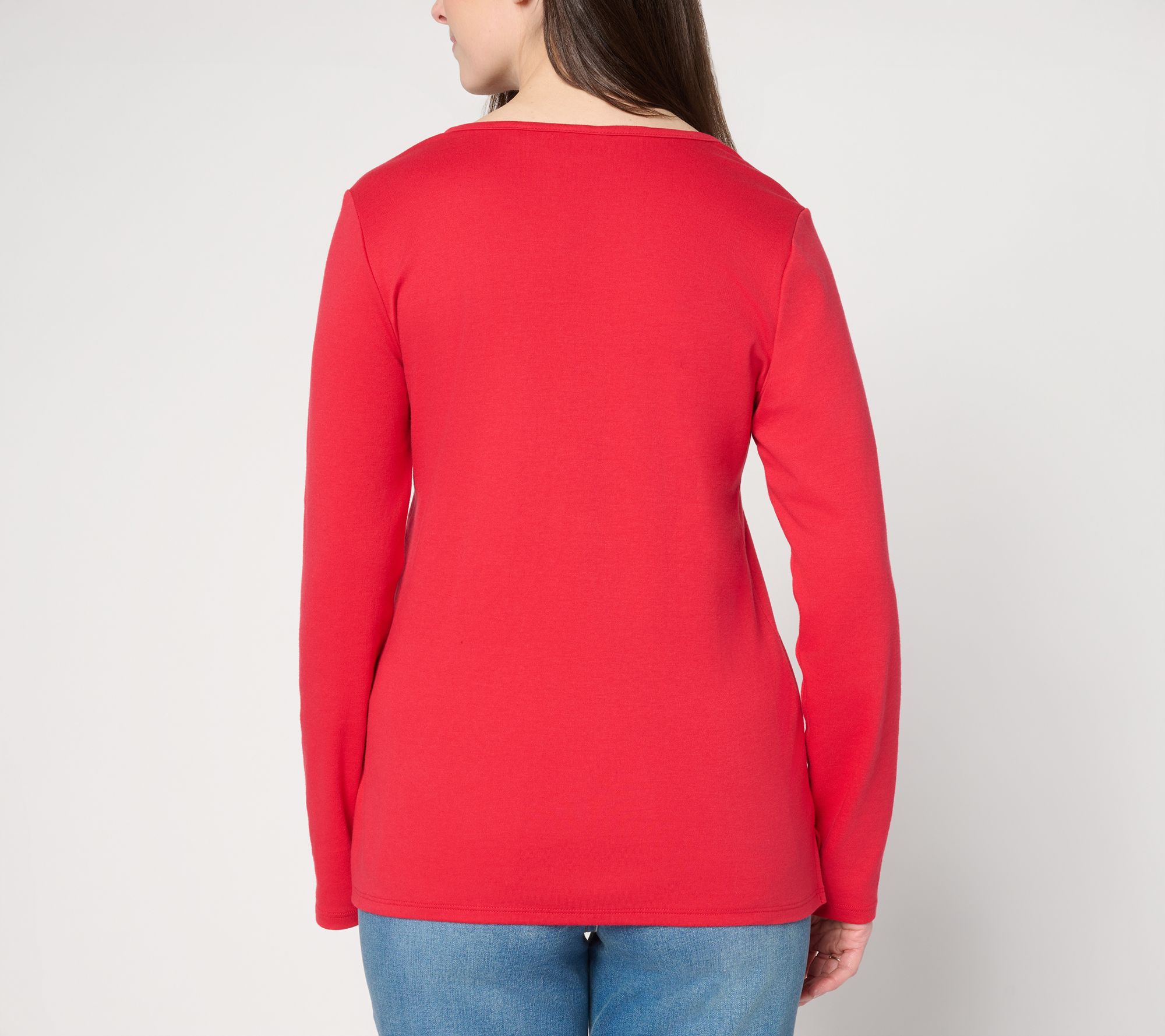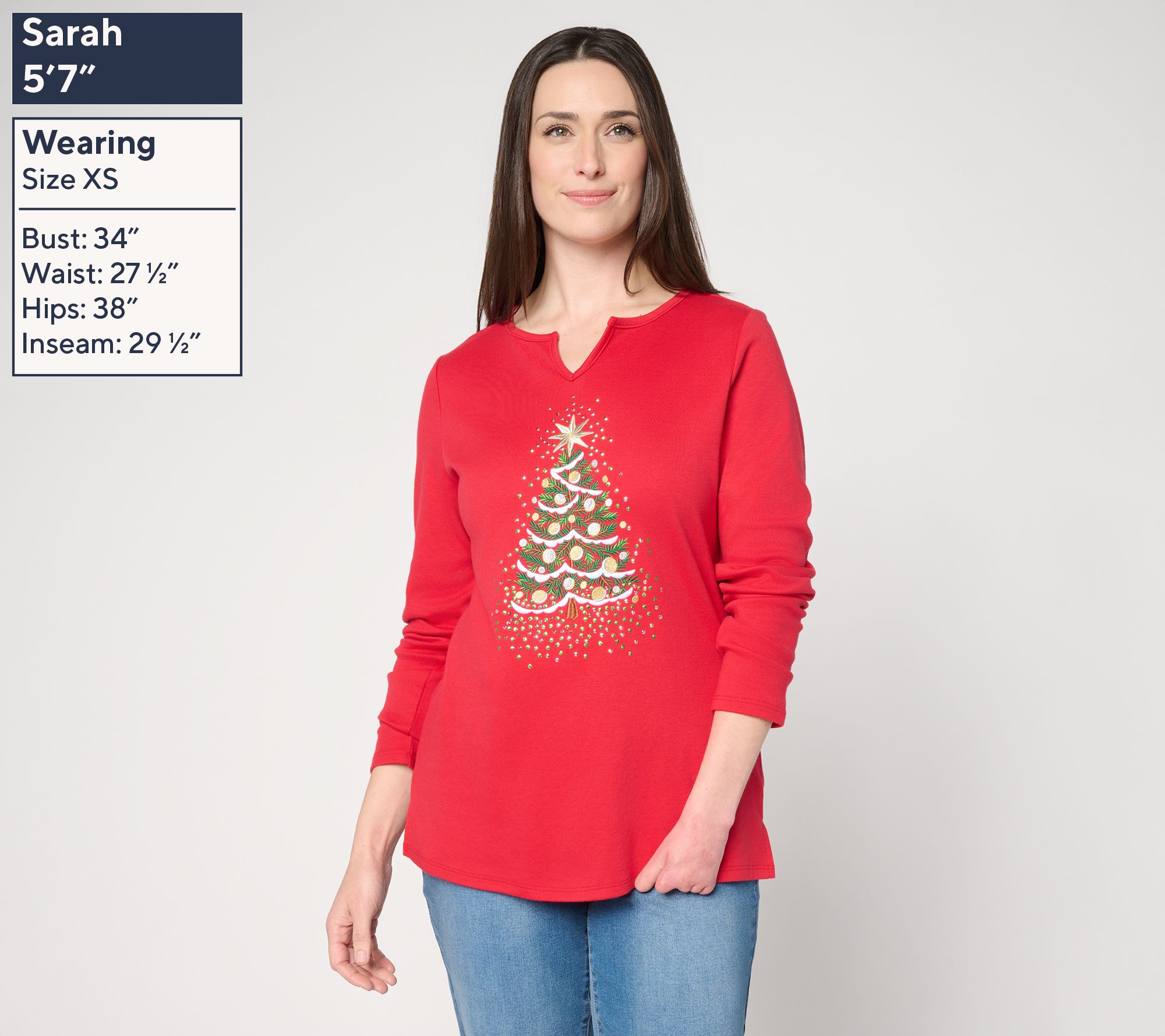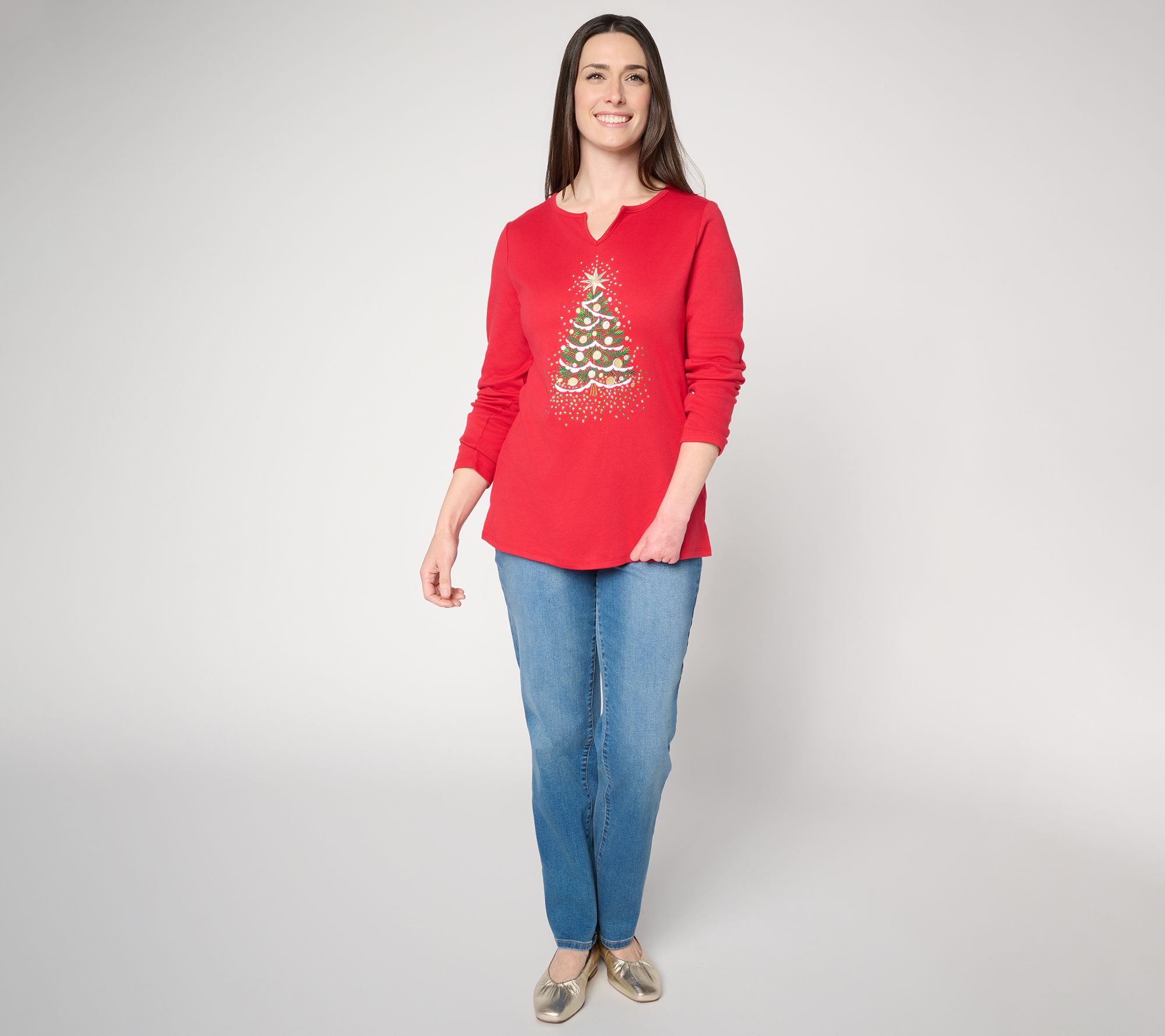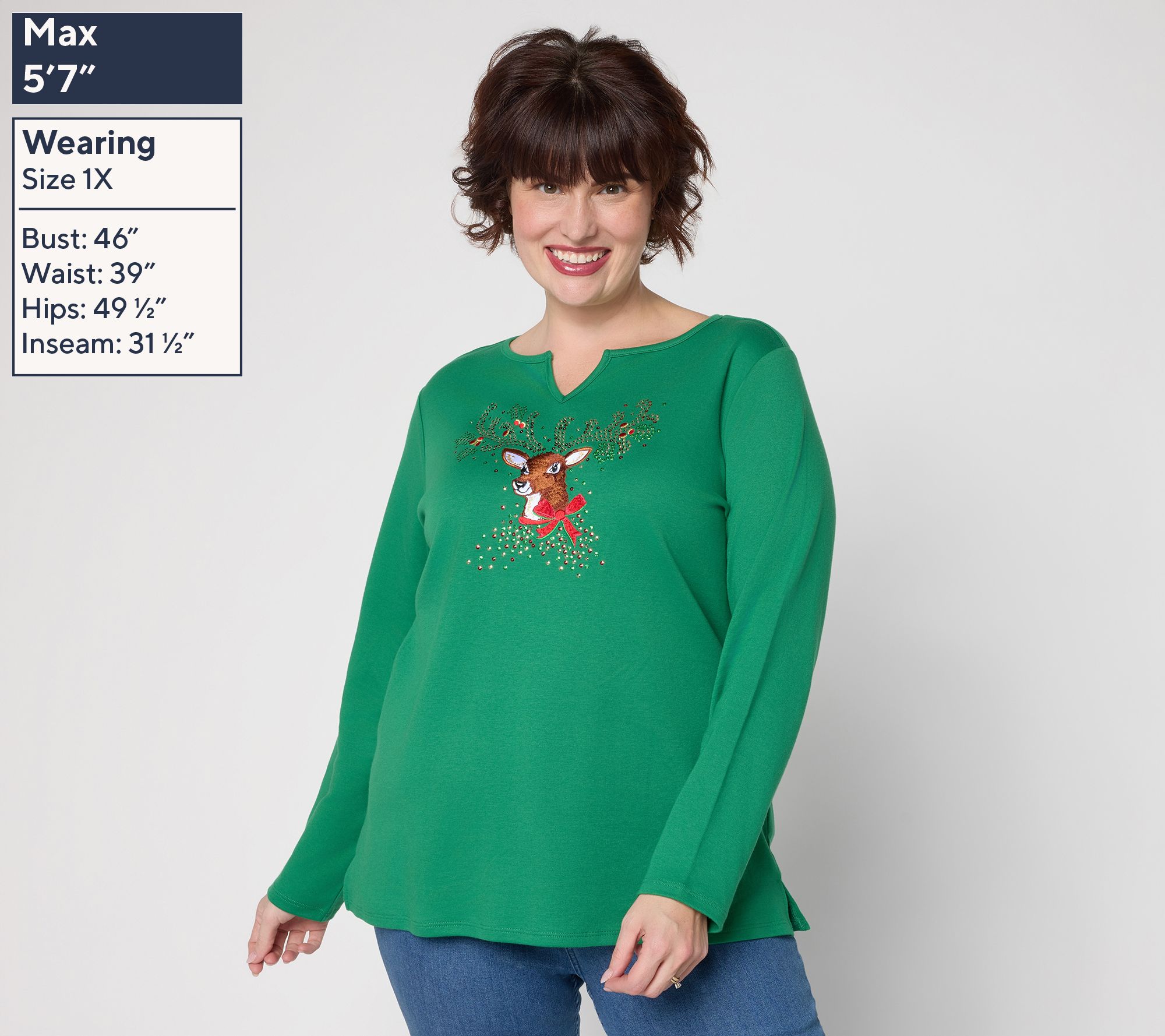 'Tis the season to celebrate! In a festive knit top styled with a straight hem and side slits for easy movement, you're comfortably and cheerfully outfitted for shopping runs, family gatherings, and every spirited moment in between. From Quacker Factory®.