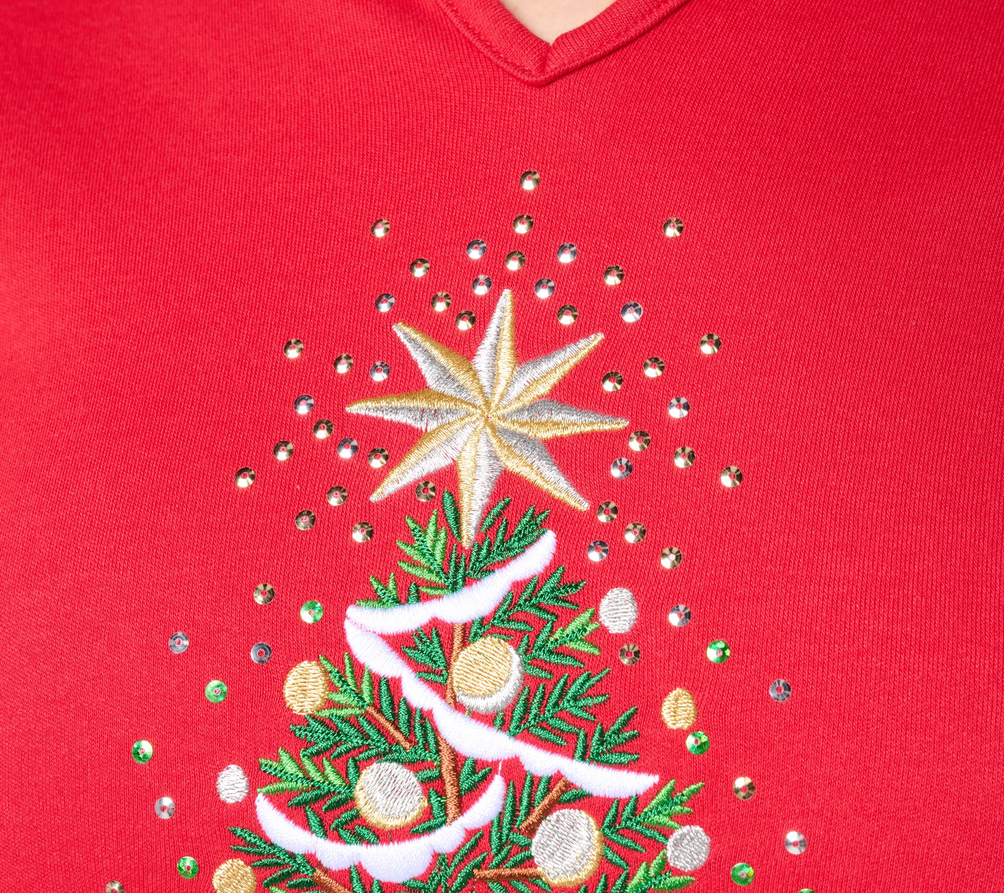 Features: embellished holiday motif, split neckline, long sleeves, straight bottom hem, side slits