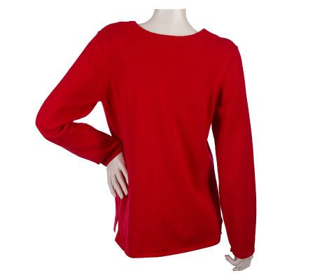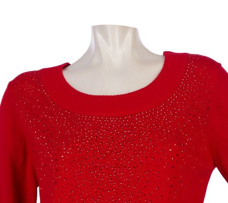 Twinkle, twinkle. Rhinestones sparkle along the front of this fabulous sweater, starting at the ribbed, scoop neckline and cascading downward. From Quacker Factory.