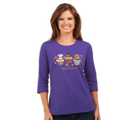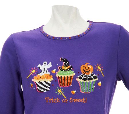 Boo to you! Celebrate Halloween in style with the Trick or Sweet Cupcake tee. More fun than fright, this shirt is decorated by festive embroidery and rhinestone details. From Quacker Factory(R).