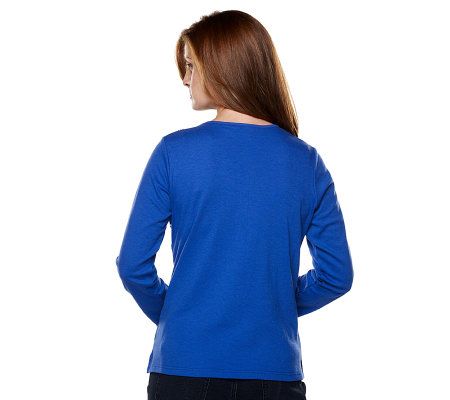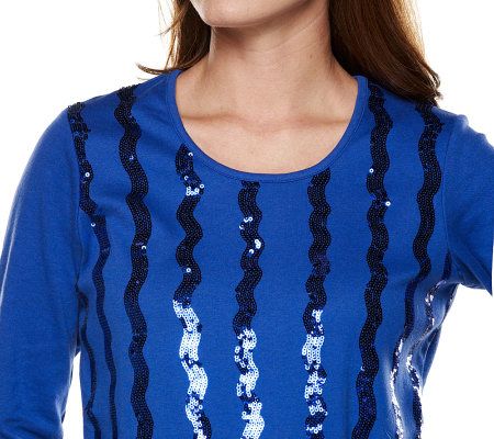 Catch the wave! You'll feel a surge of style energy when you wear this long-sleeve T-shirt, designed with ripples of sequins rolling vertically along the front. From Quacker Factory.