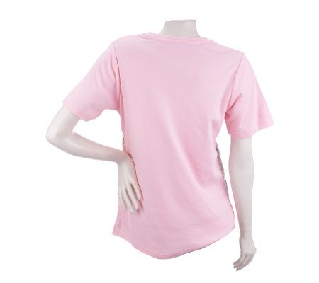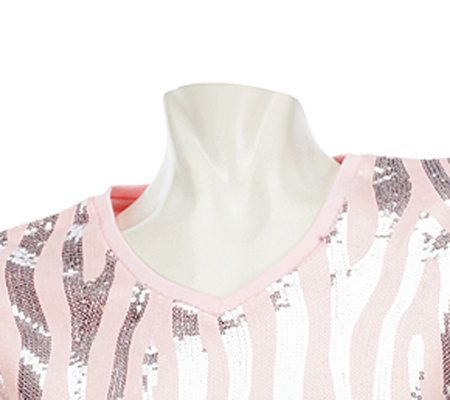 Glitter girl. Shine on in sequins and zebra stripes in this V-neck tee. Short sleeves and a fashion-forward zebra pattern make this the perfect way to light up the night. From Quacker Factory.