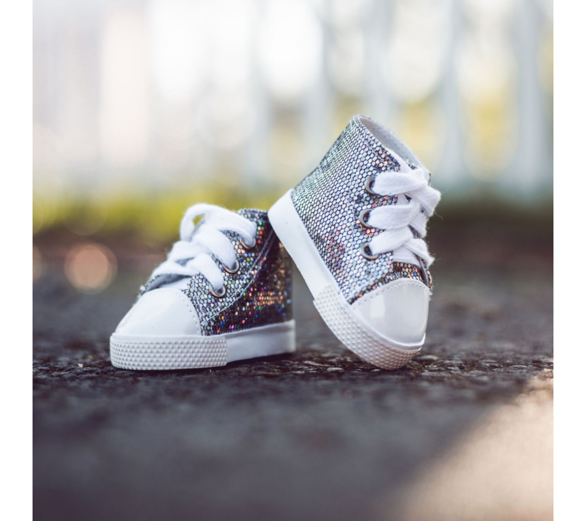• Includes pair of silver sparkle high top shoes, white bow dress up shoes, work boots, brown lace-up boots, shoe boxes and five shoe shop signs
