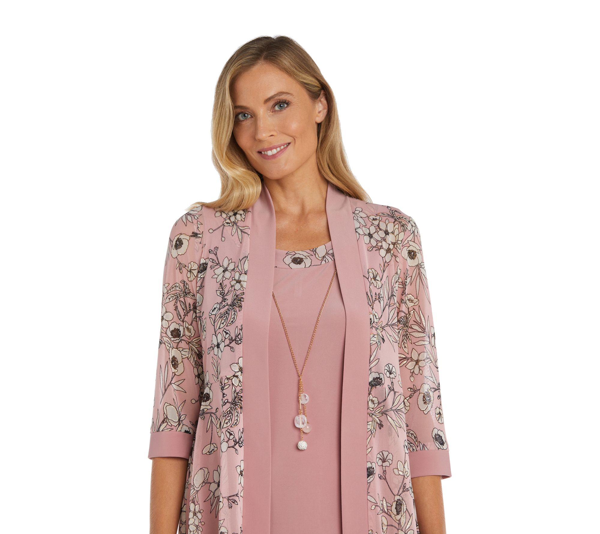 Coordinate your evening ensemble with this jacket and dress combo accompanied by a dazzling necklace. From R&M Richards.