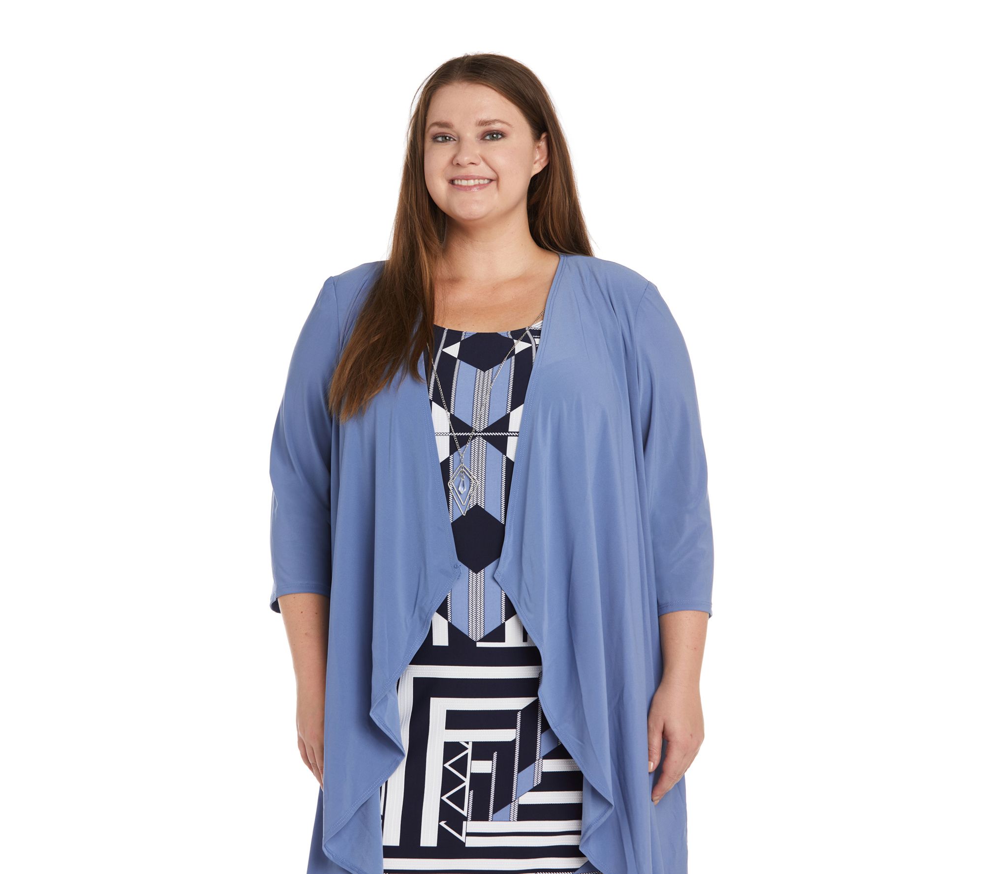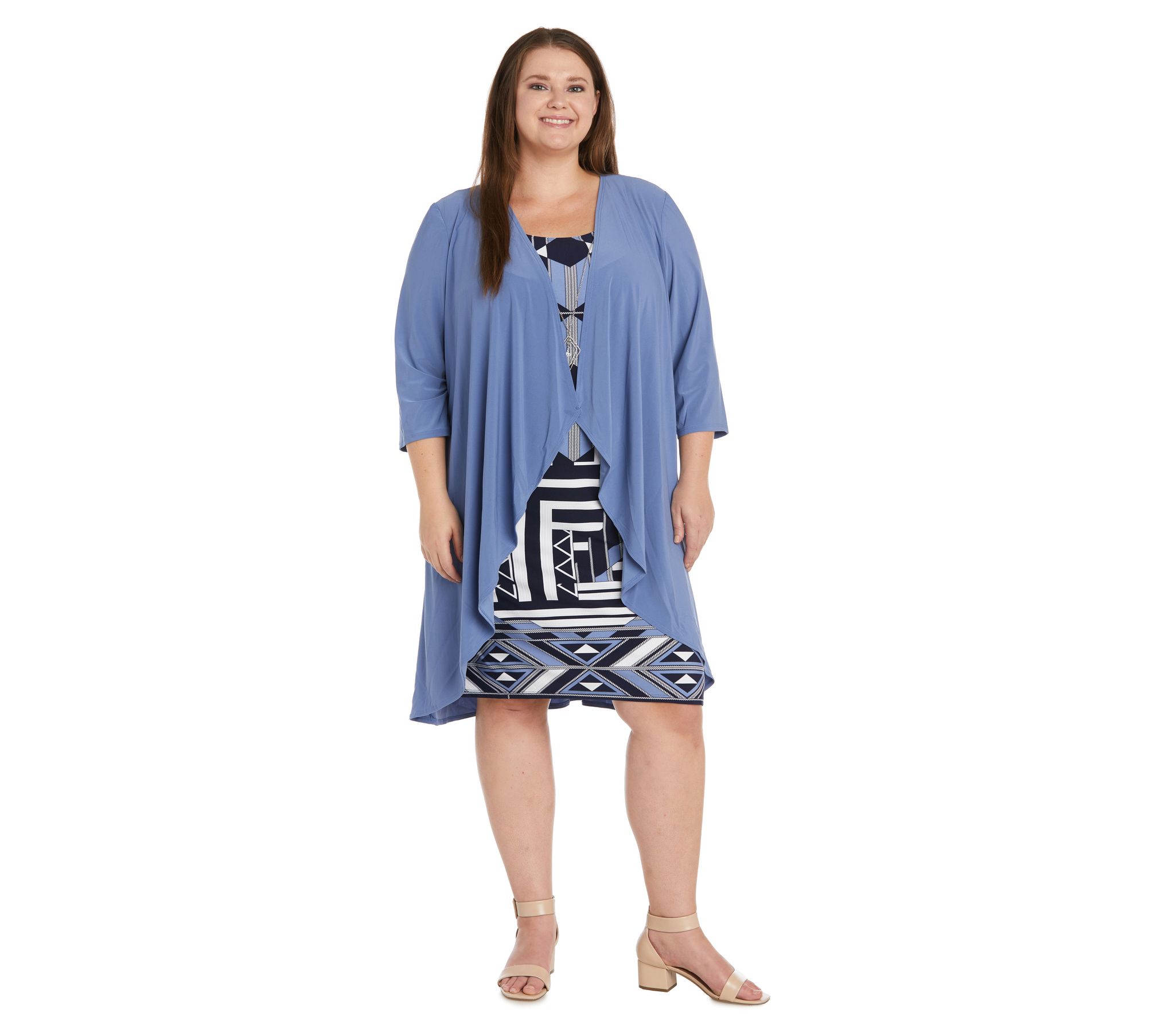 Coordinate your look for the evening with this marvelous printed dress and flowing jacket ensemble topped off with an eye-catching necklace. From R&M Richards.