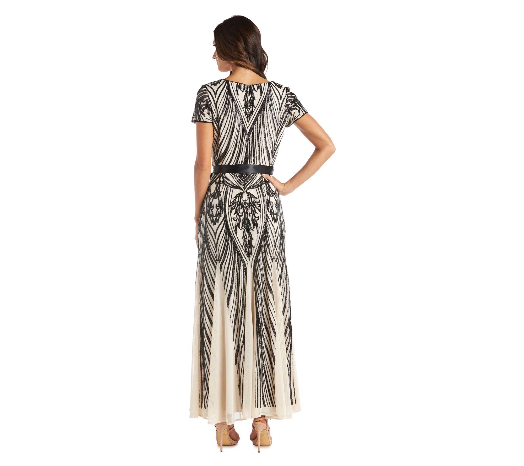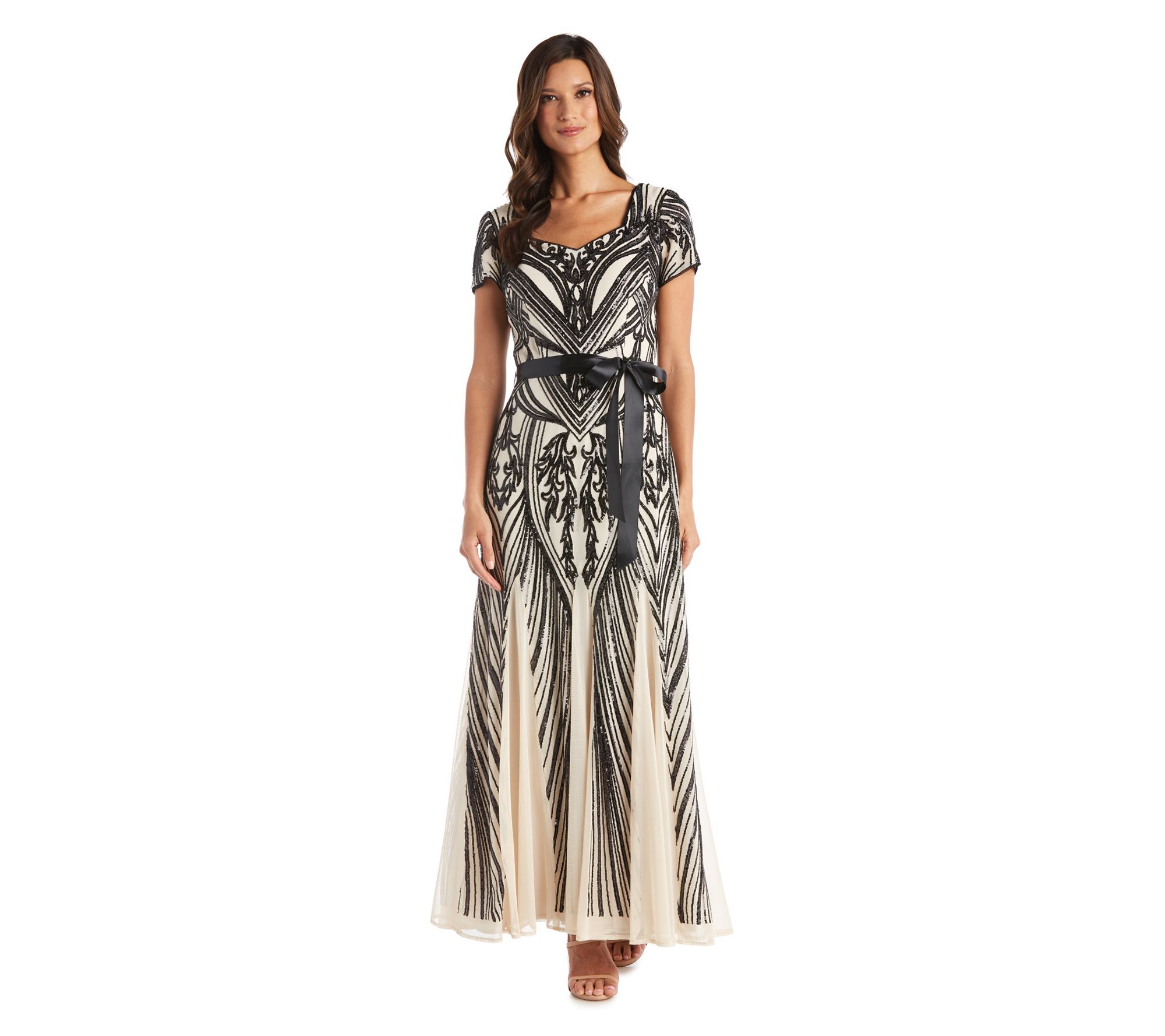 You'll be sure to shine when you slip on this elegant evening gown adorned with a bevy of sparkly sequins. Featuring an ankle-skimming length, cinched waist, and fishtail-style pleated skirt, you'll be the belle of any ball while wearing it. From R&M Richards.