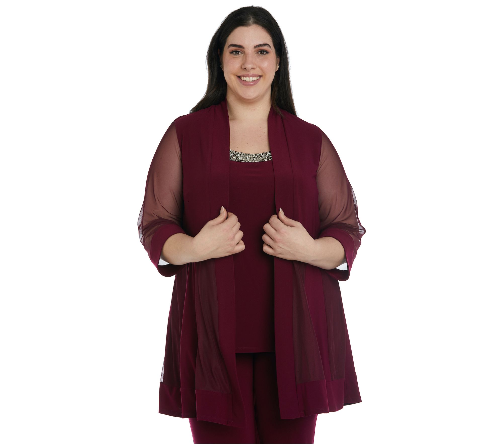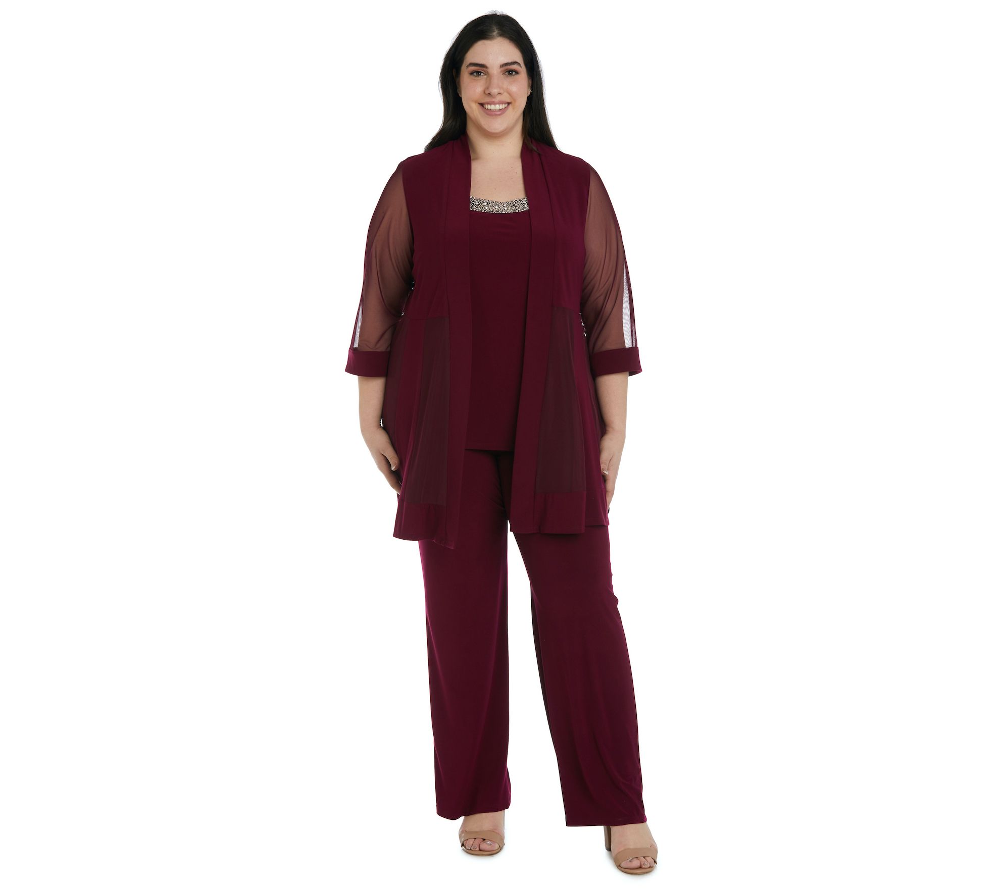 Step out in elegant, effortless style with this pant suit and matching jacket, perfect for your evening look, it takes the guesswork out of dressing for the occasion. From R&M Richards.