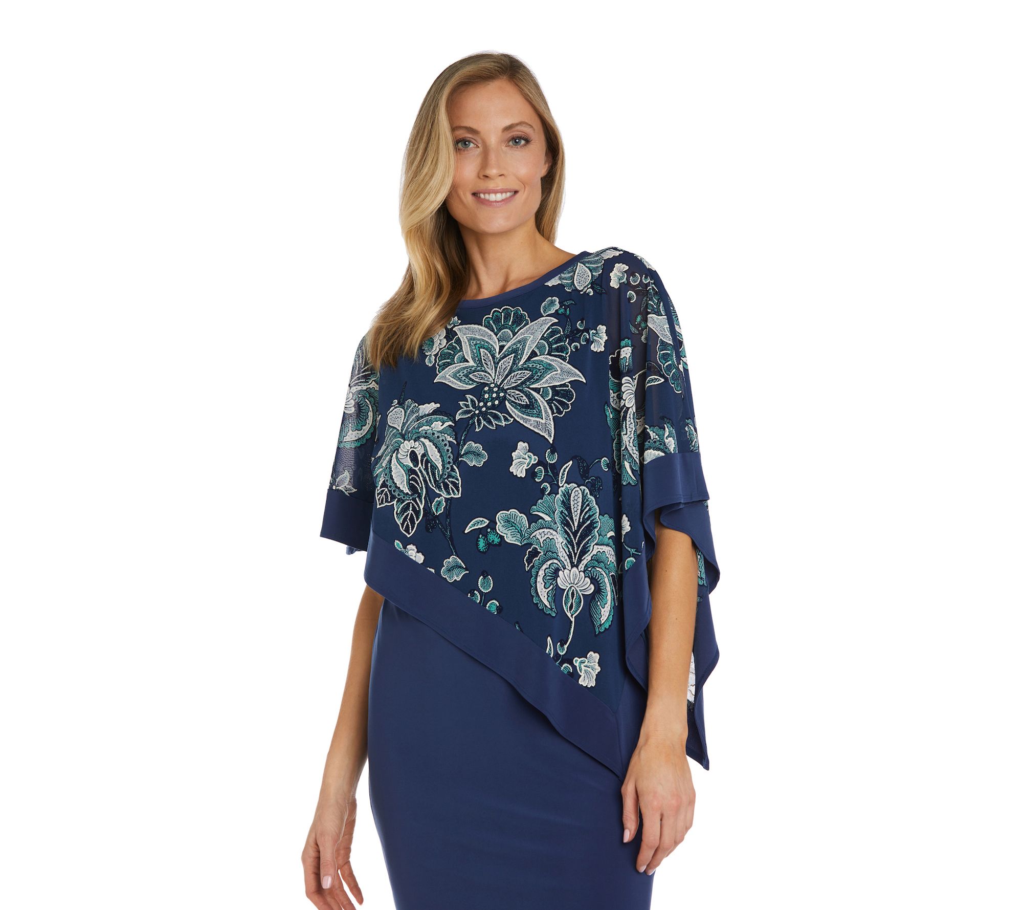 Make an elegant entrance in this two-piece sheath dress featuring a lacy poncho layer sprinkled with sequins. From R&M Richards.