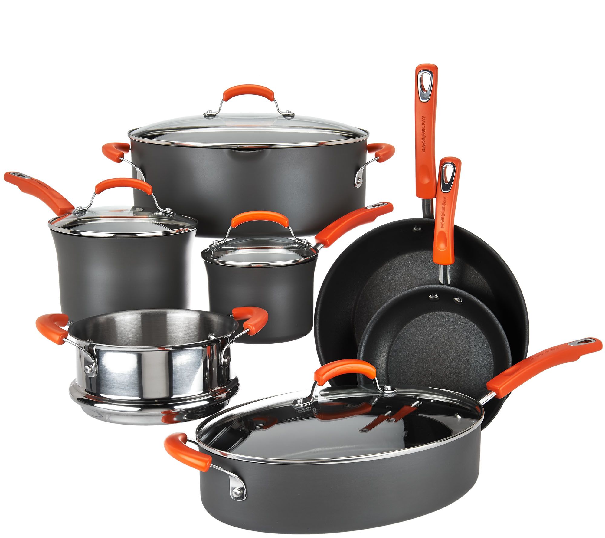 Includes 5-qt covered oval saute pan, 8-qt covered oval pasta pot, 3-qt covered saucepan with steam insert, 1.5-qt covered saucepan, 11-1/2" skillet, and 8-1/2" skillet