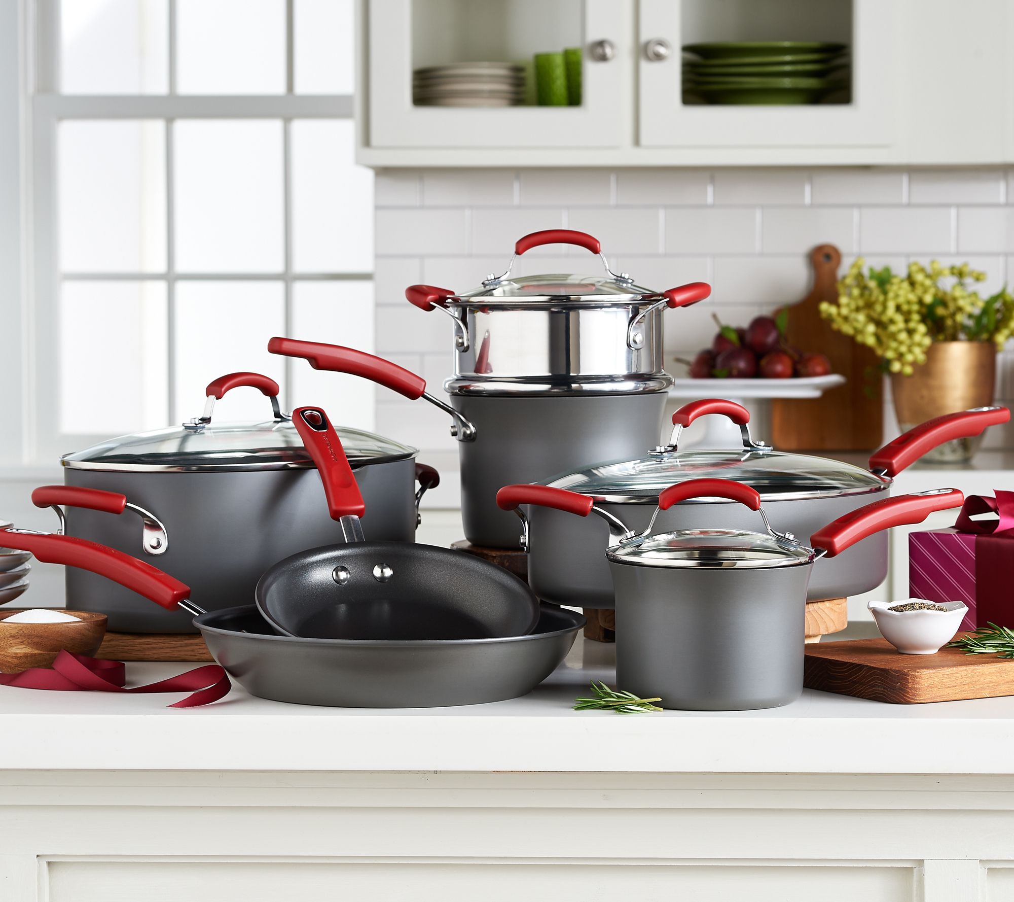 Since this set comes with large pieces like an 8-quart pasta pot, a 5-quart saute pan, and an 11-1/2" skillet, you've got the tools to tackle dishes both large and small. Once cooking is complete, cleanup is easy thanks to nonstick interiors. Durable, yet lightweight, this set is ready to help take your culinary creations to the next level. From Rachael Ray.