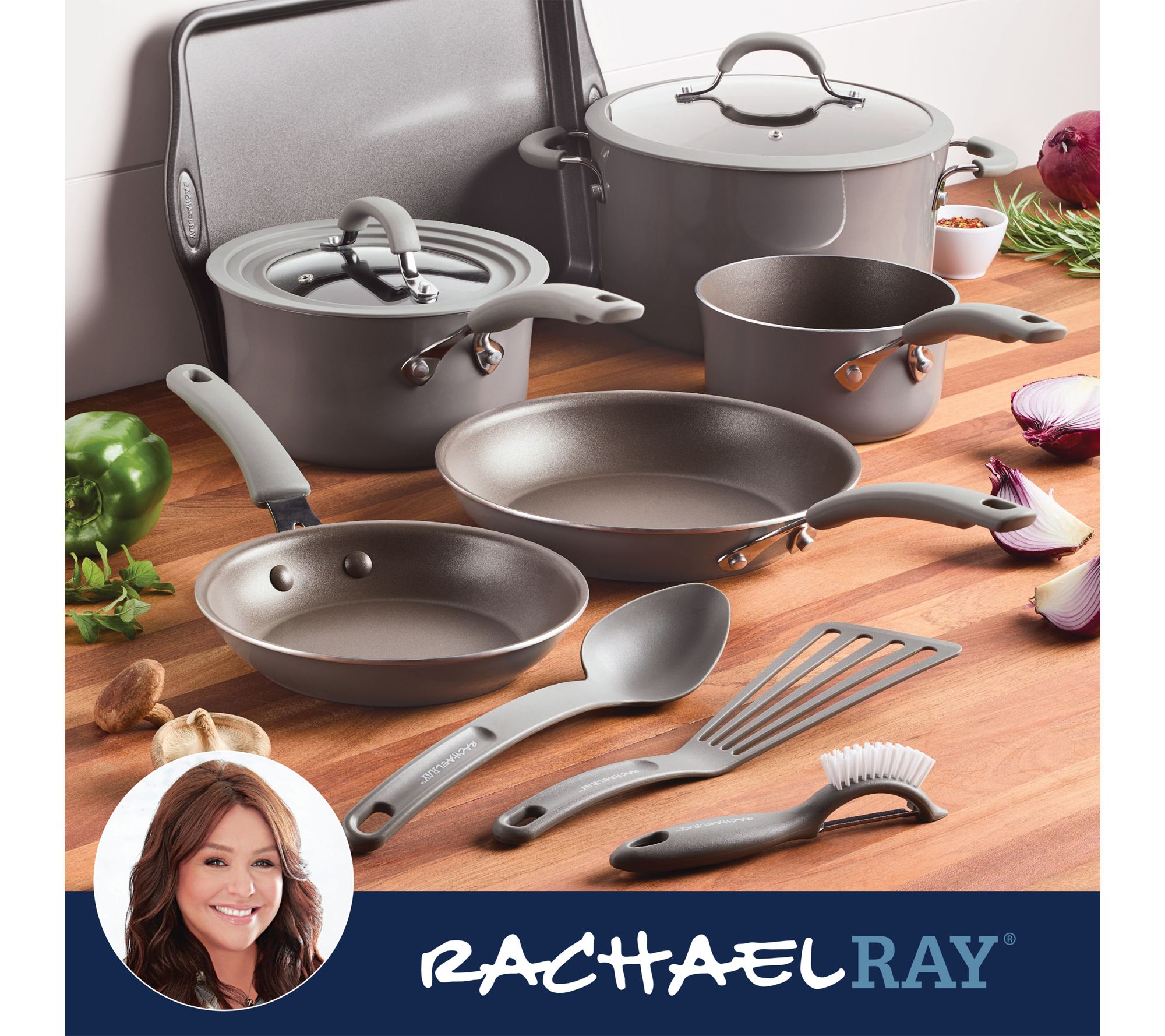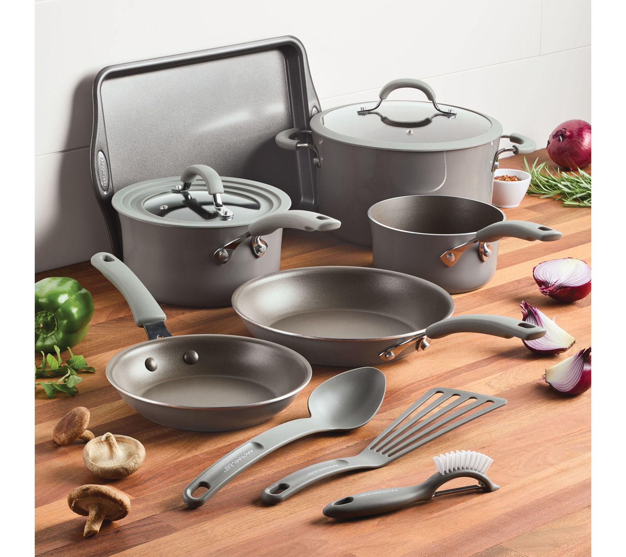 Whipping up weeknight dinners or weekend brunches becomes a breeze with this versatile cookware set, offering effortless cleaning and reliable, even heating every time. From simmering sauces to sauteing veggies -- these thoughtfully designed pans and tools help you master big family meals or quick bites, while space-saving universal lids keep your kitchen organized and cooking efficient. From Rachael Ray.