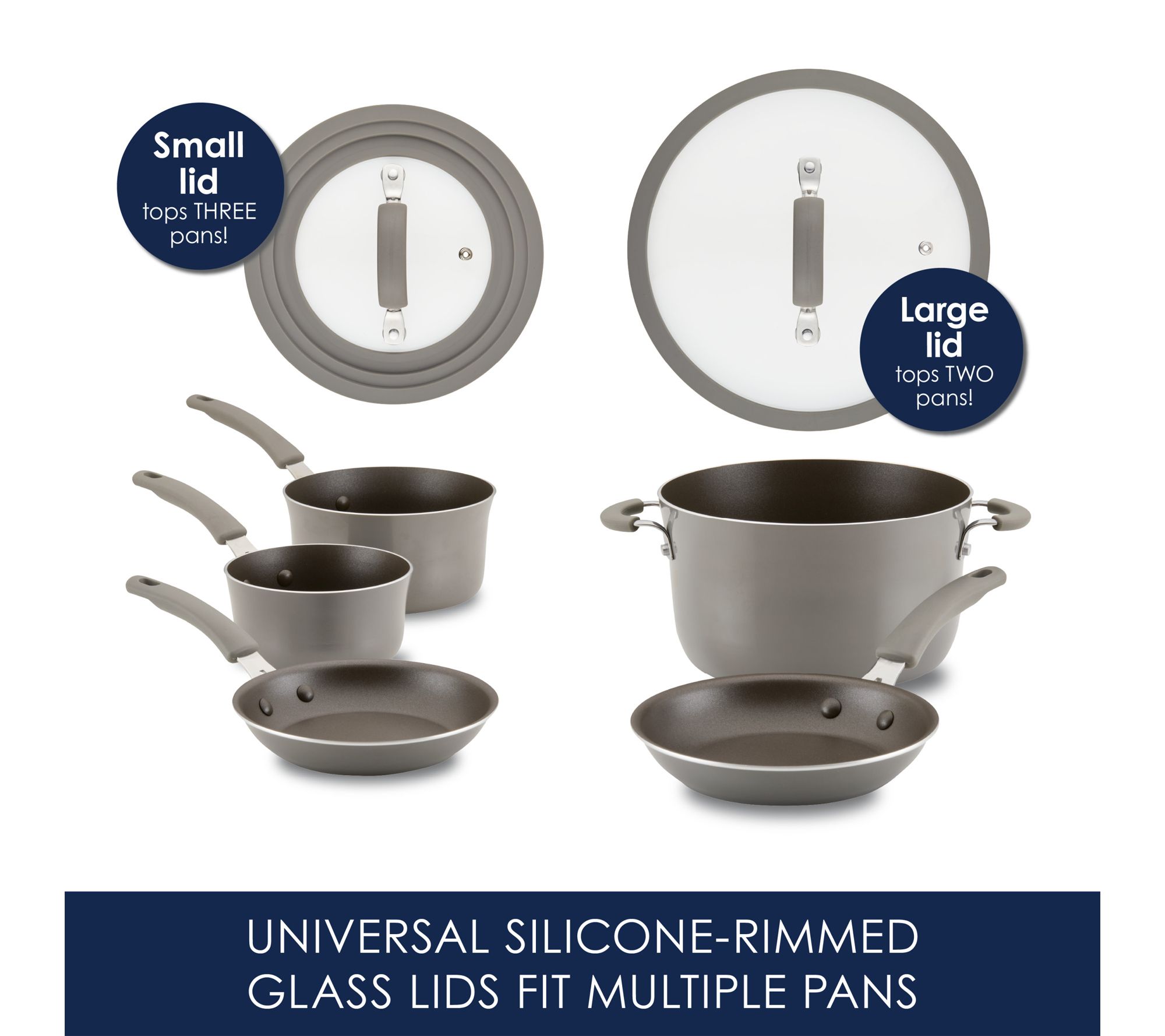 Universal tempered glass lids with silicone rims; one lid features stepped edge to fit multiple pans