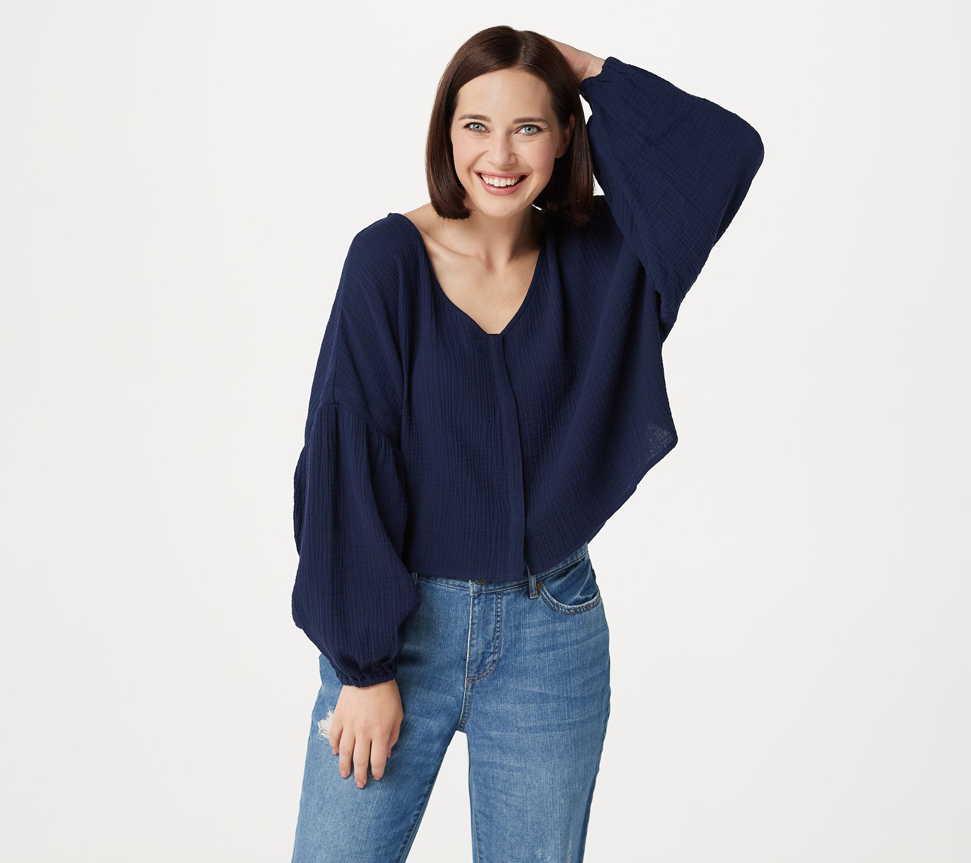 This trendy top is perfect for date night or a casual weekend excursion. Fun, flirty details you'll love are its voluminous sleeves and hi-low hemline. From Rachel Hollis Ltd.