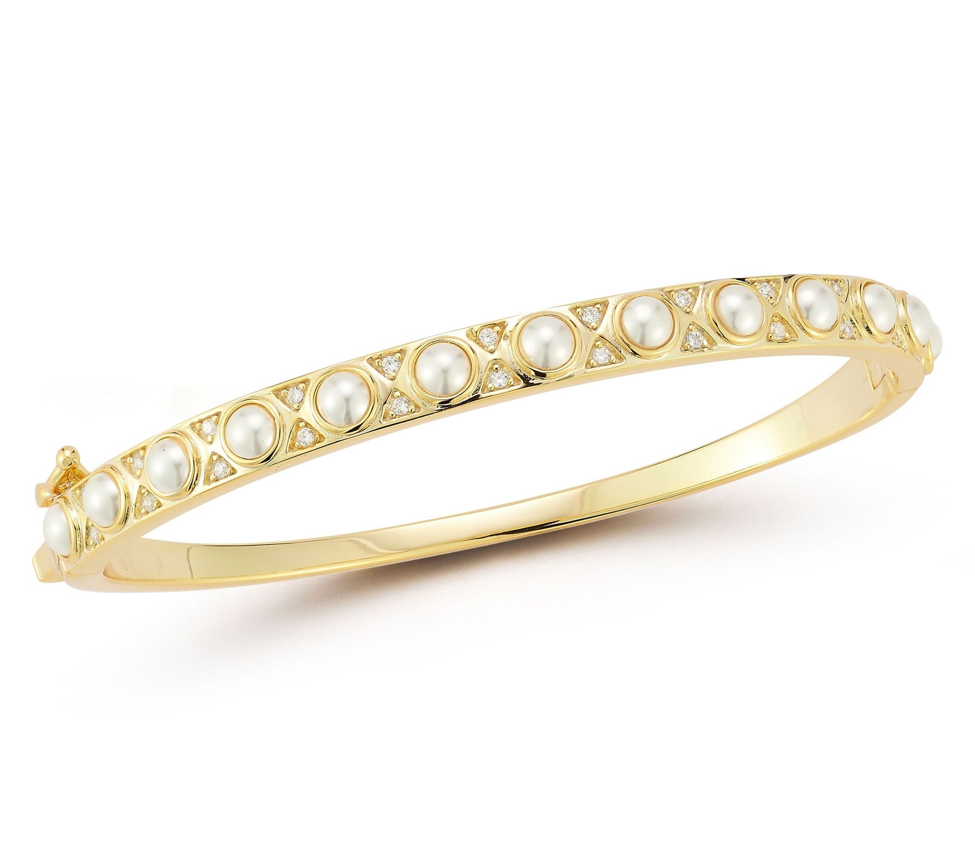 The perfect blend of elegance and versatility, this stunning bangle sparkles with every movement, while cultured freshwater pearls add a timeless touch. From Rachel Zoe.