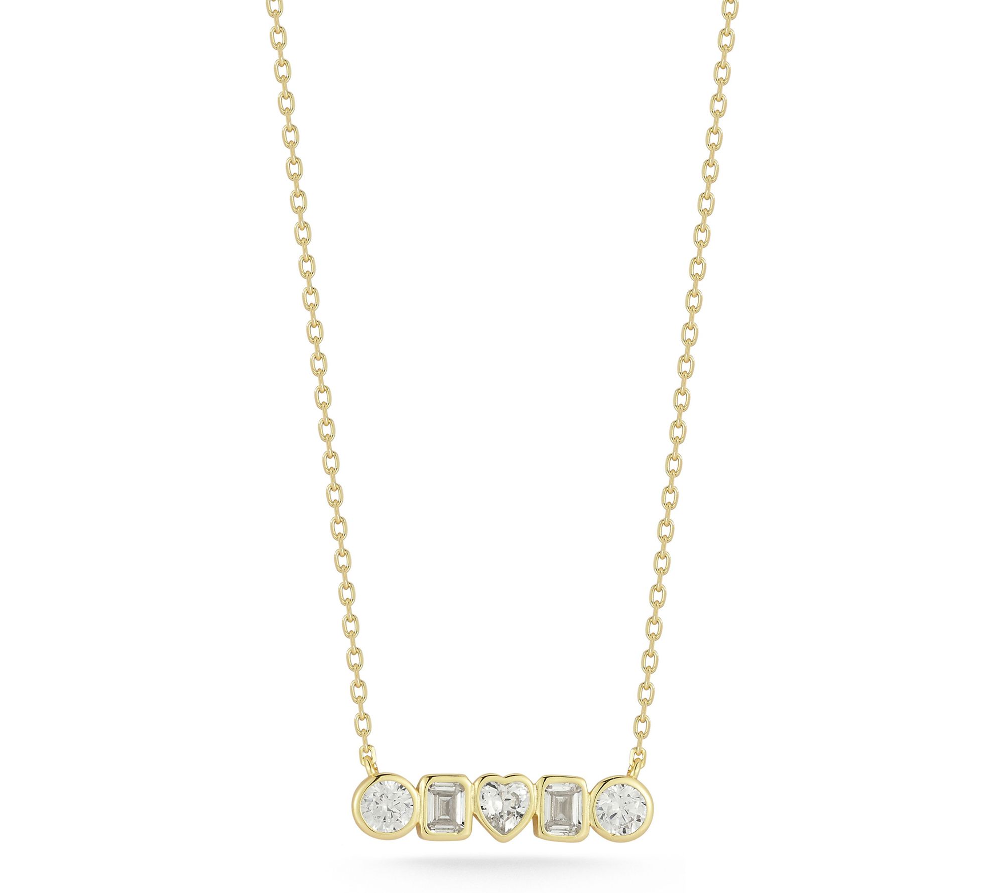 • Features a bar pendant design with multi-shape bezel-set cubic zirconia stones; emerald, heart, and round cuts; cable chain