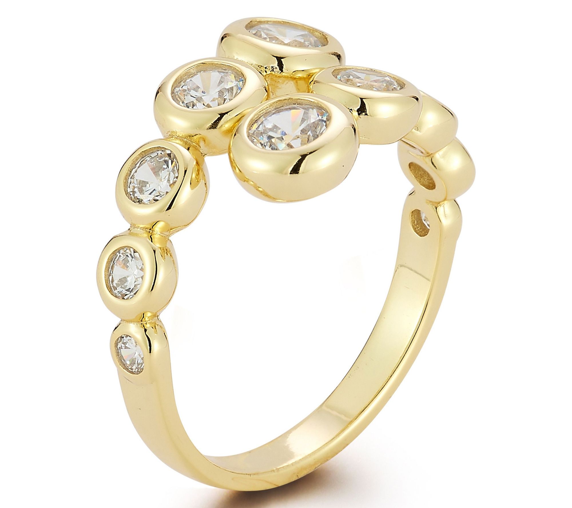 • Round, bezel-set simulated cubic zirconia stones; bypass ring with bubble design