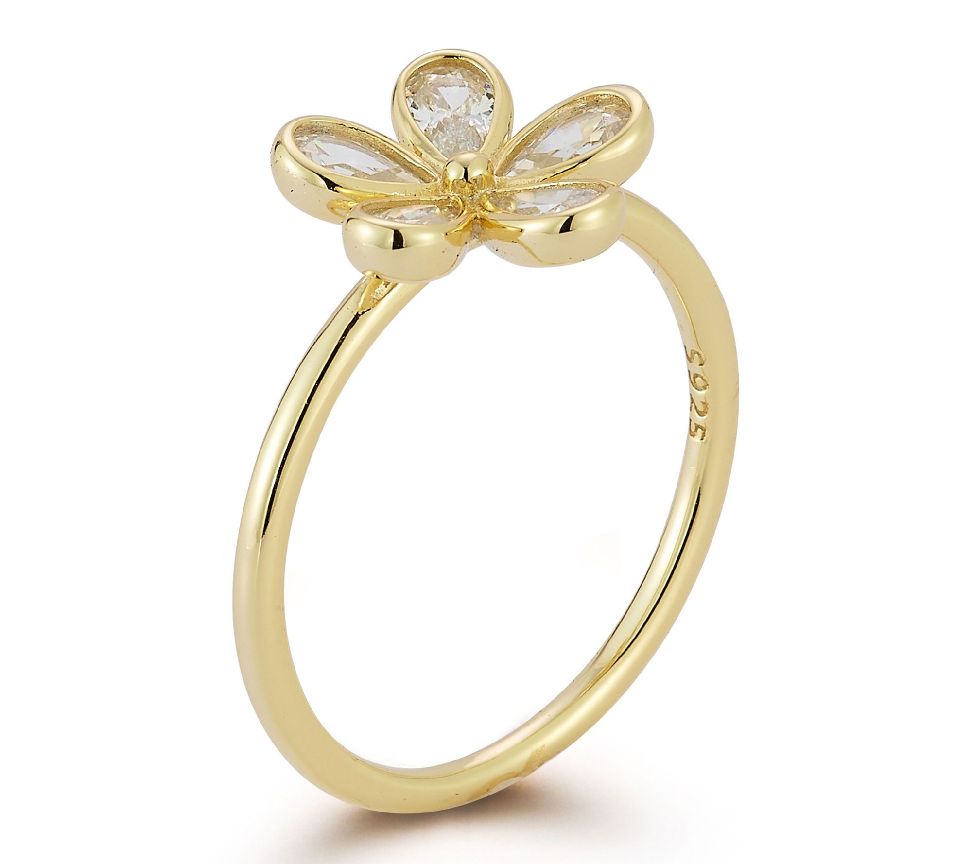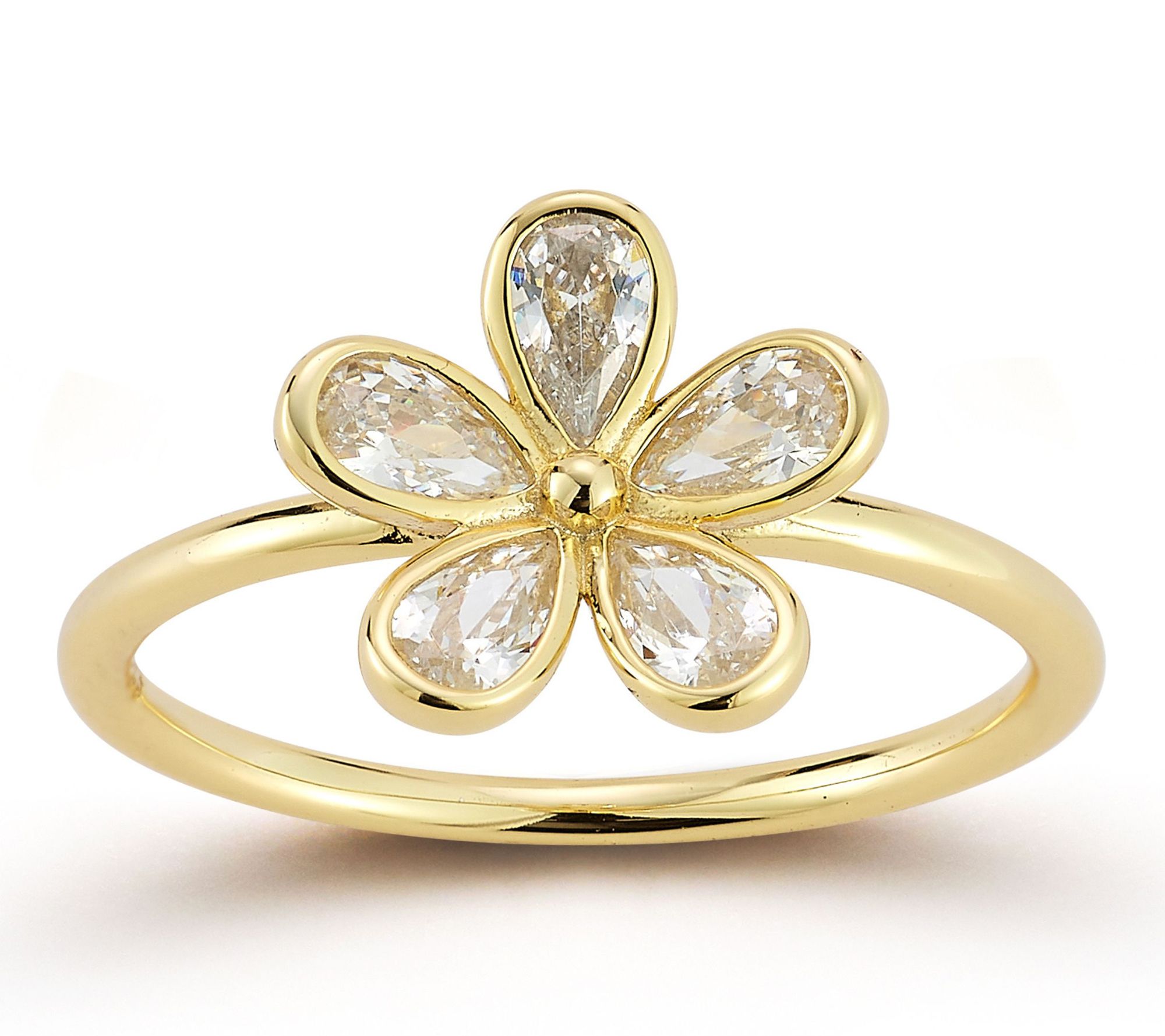 • Pear-cut, bezel-set cubic zirconia; flower center design; thin band
