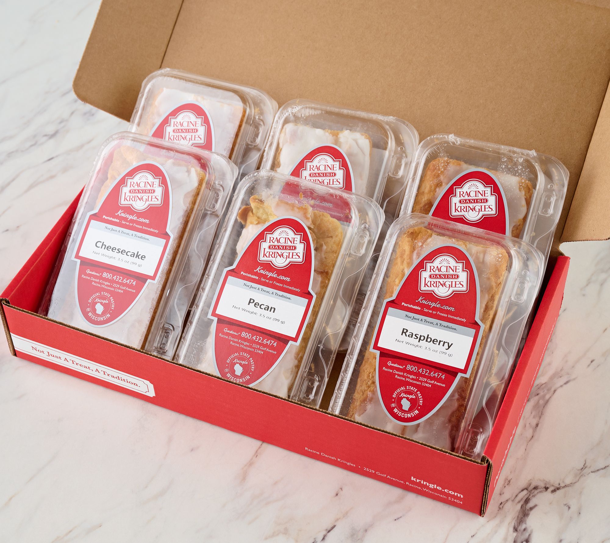 • Includes six 3.5-oz kringle: two each of pecan, cheesecake, and raspberry
