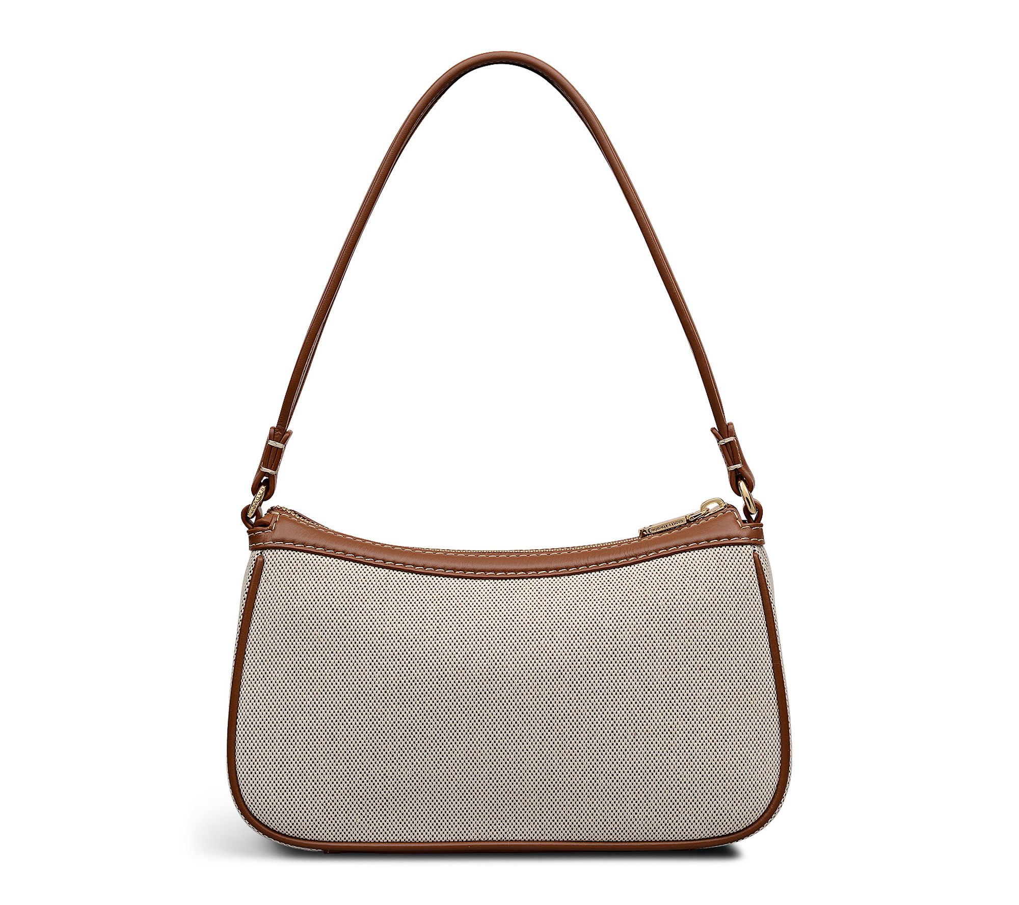 • Durable canvas exterior with smooth leather trim, structured piping, single handle, set-down zip top closure, dog tag detail, detachable and adjustable convertible strap, goldtone hardware