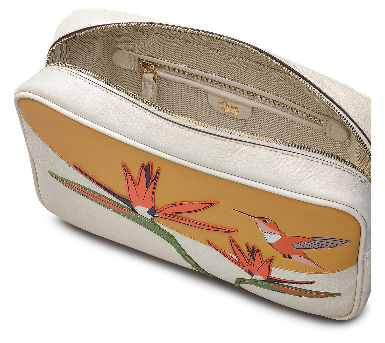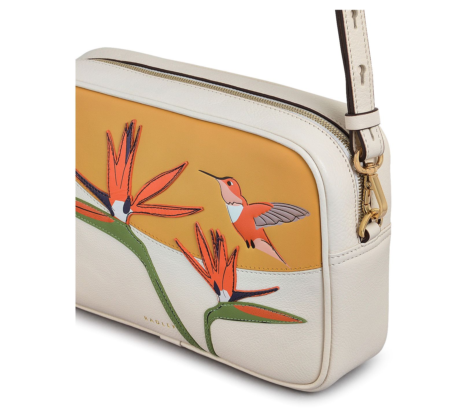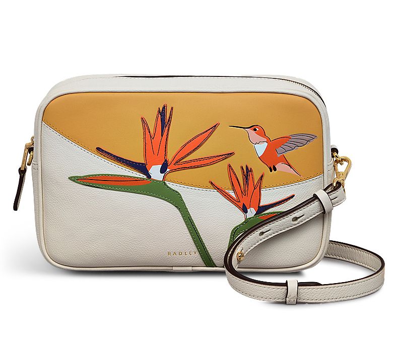 Explore the charm of nature with a touch of artistry in this Birds of Paradise crossbody. Crafted from grained leather, it's a masterpiece adorned with exquisite applique, inlay, and screen prints, capturing the essence of exotic flora. Its compact camera bag silhouette makes it perfect for everyday adventures, effortlessly blending style with functionality. The adjustable strap ensures comfort as you carry your essentials securely. Elevate your daily ensemble with this artistic accessory. From Radley.