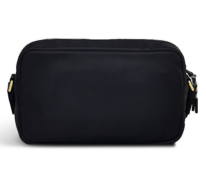 • Zip-top closure, adjustable webbing strap, shiny goldtone hardware
