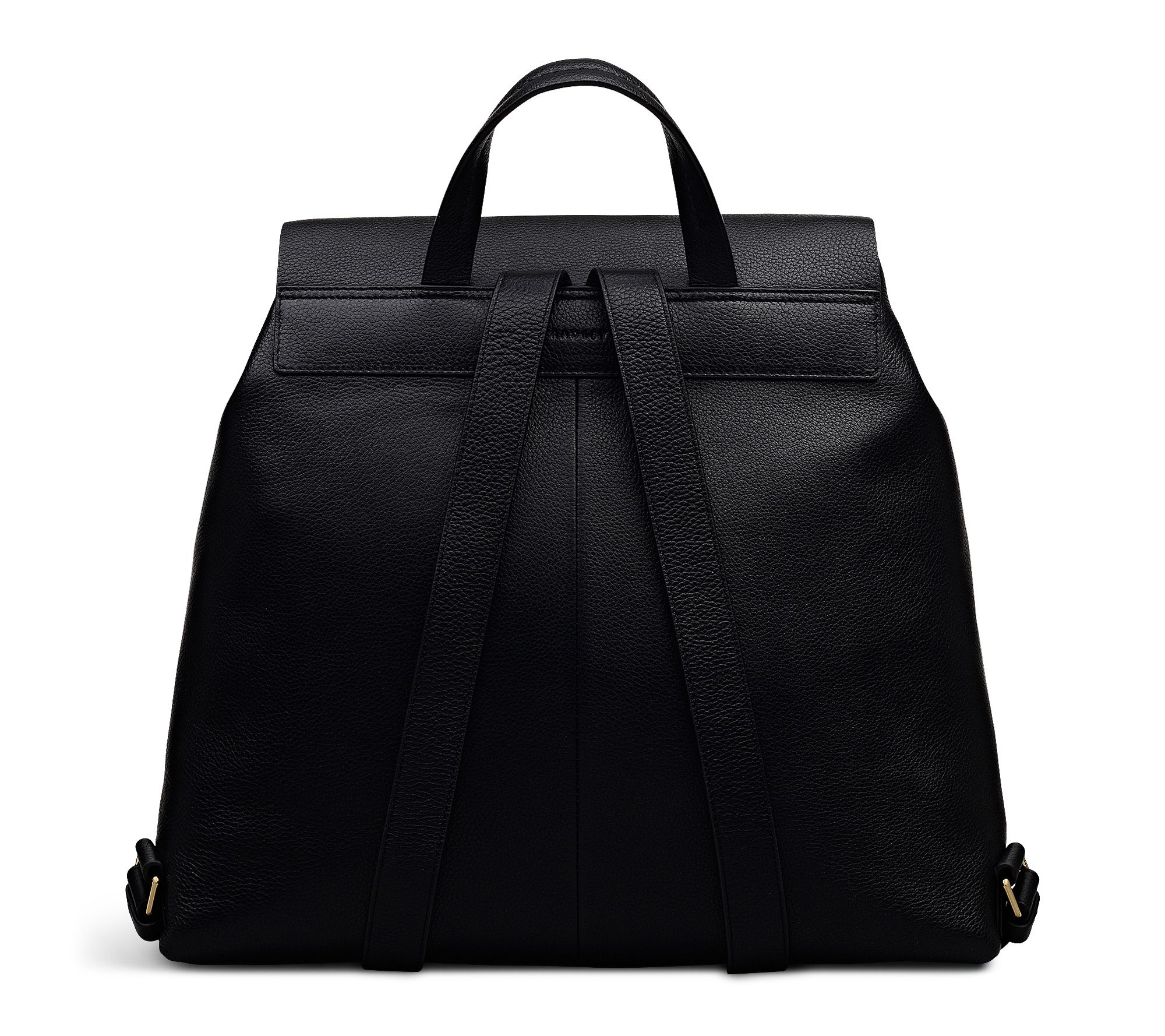 • Buckle and push-lock closure, single padded grab handle, adjustable leather shoulder straps, flap pockets with contrast stitch outlines, foil logo on front, blind emboss logo on back, leather-covered magnetic corners, suedette under main flap