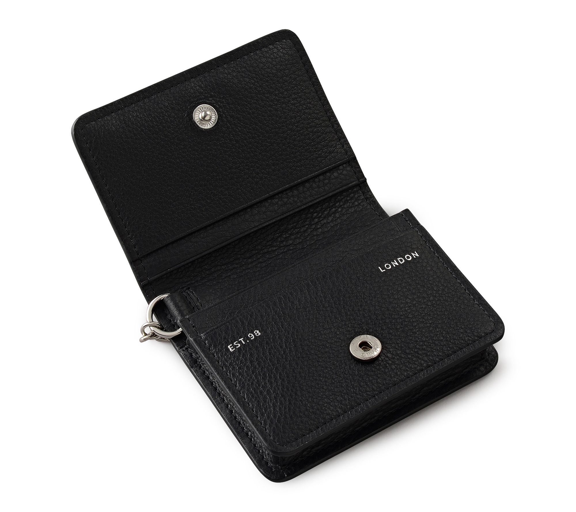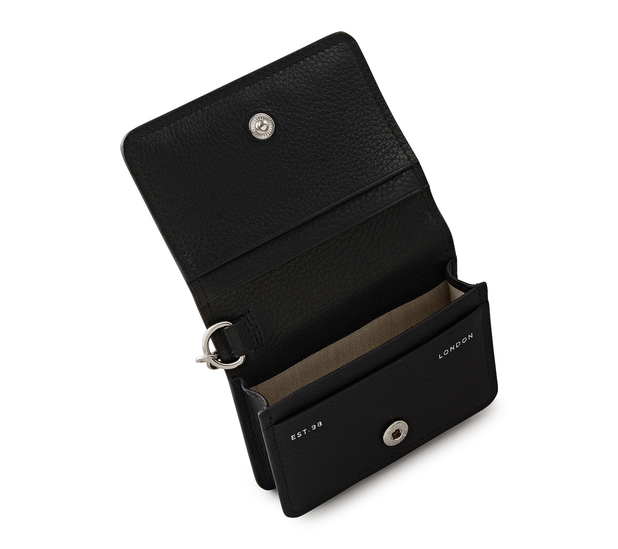 Grain leather exterior with flap and leather-covered press stud closure, detachable wristlet chain strap with T-bar fastening, silvertone hardware, contrast interior, foil logo, heritage mark