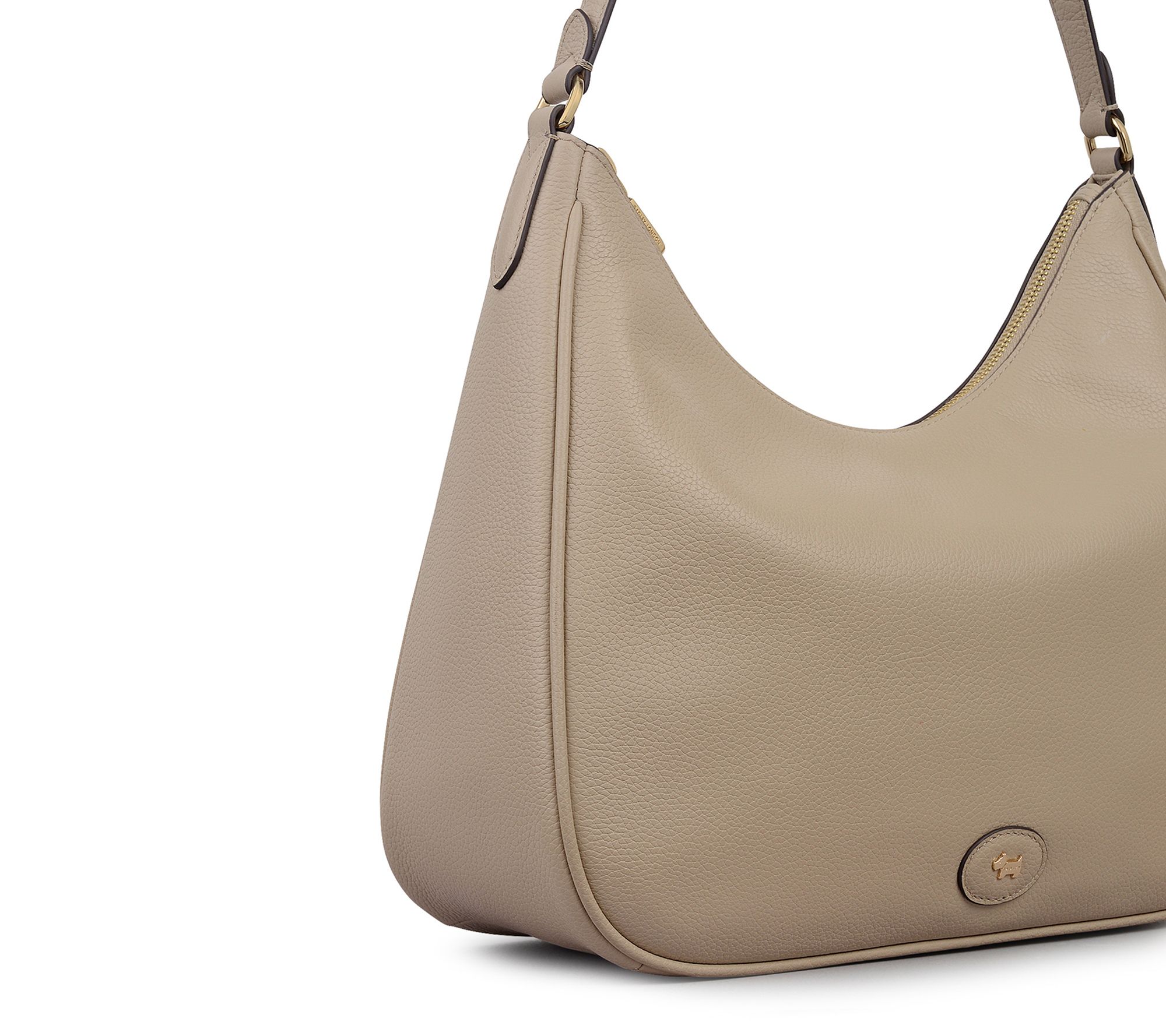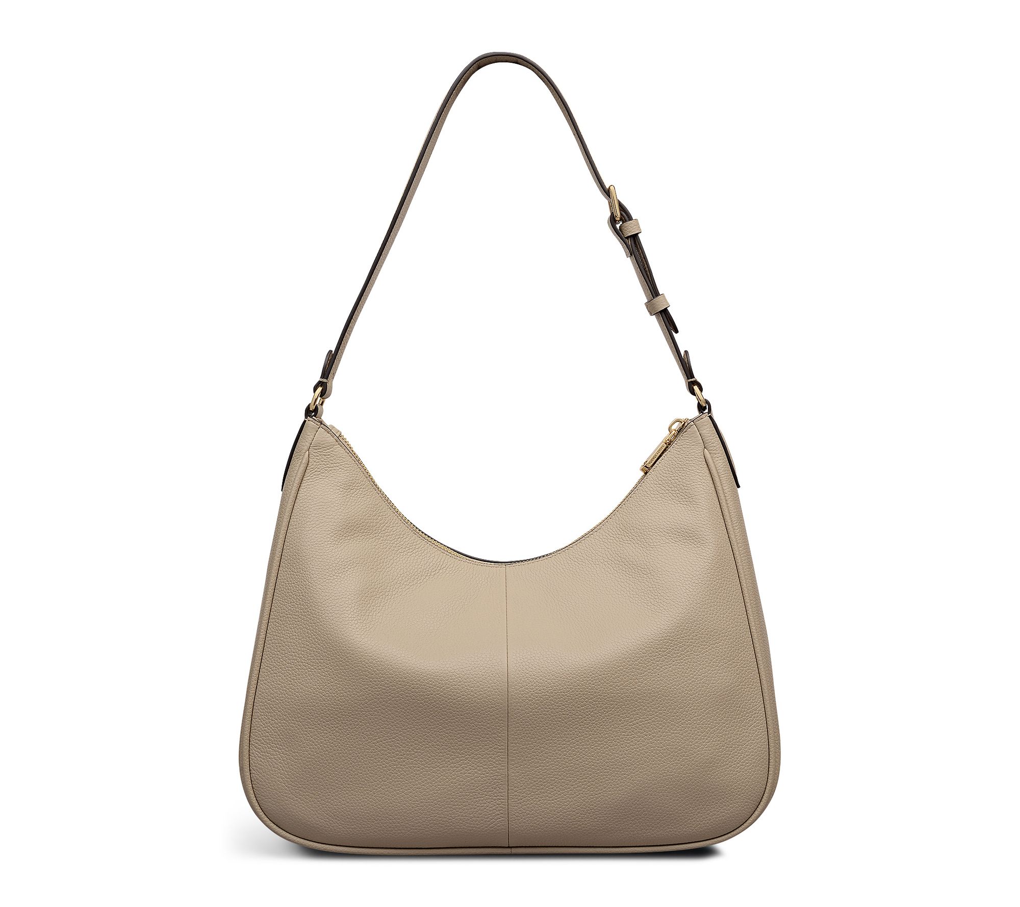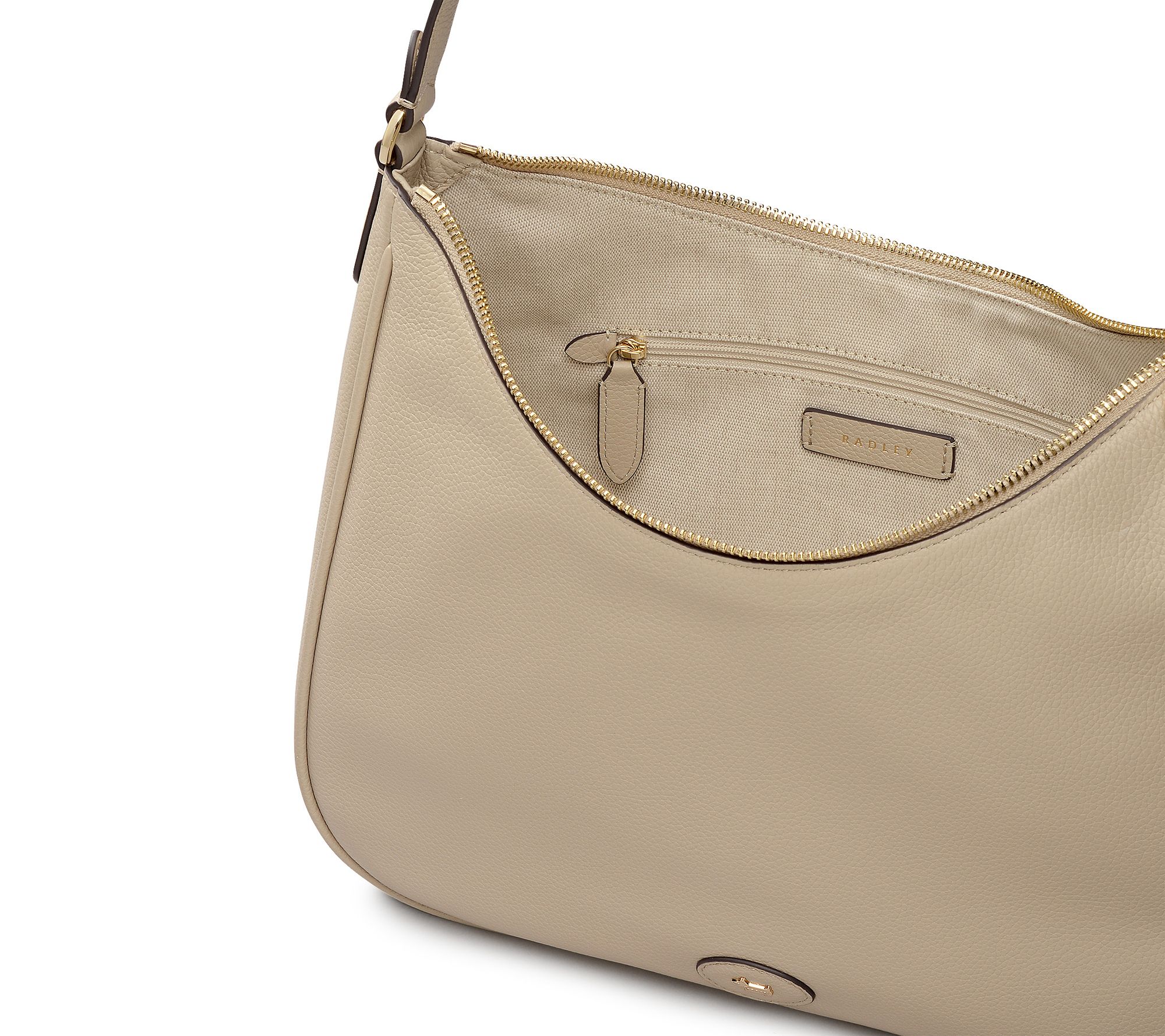 Chic for the office or weekend outings, this shoulder bag blends smooth grain leather with a curving silhouette and goldtone accents that shine on your arm. Adjust the strap for the perfect hands-free fit, then reach for your phone or keys easily with the help of organized interior pockets. From Radley.