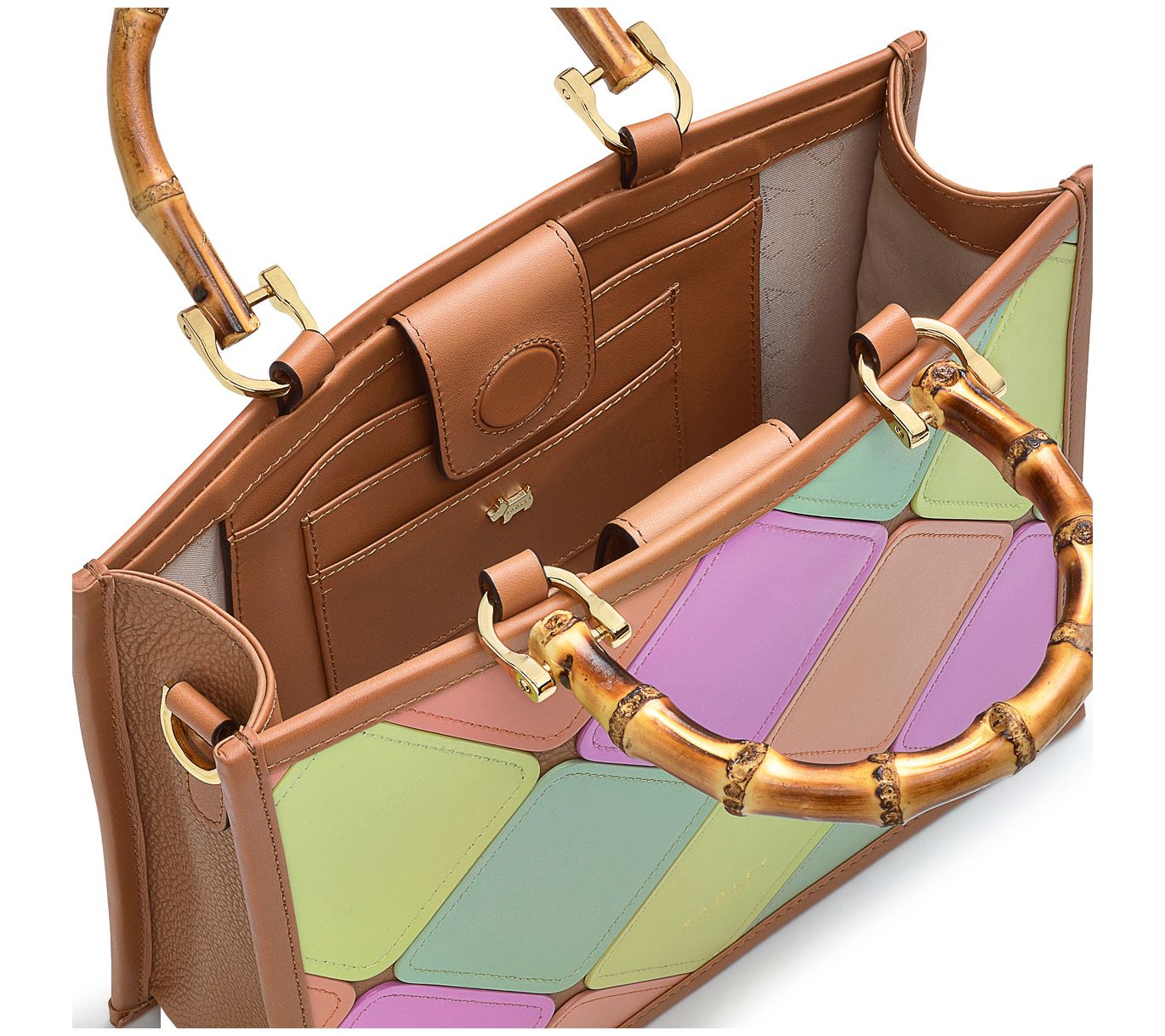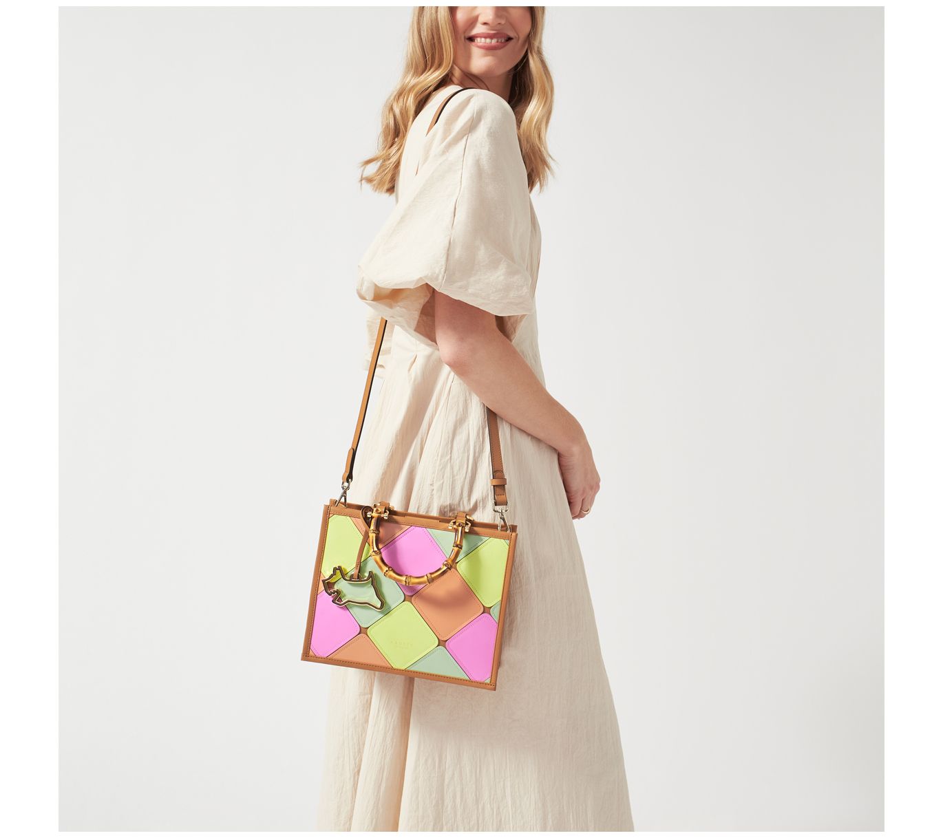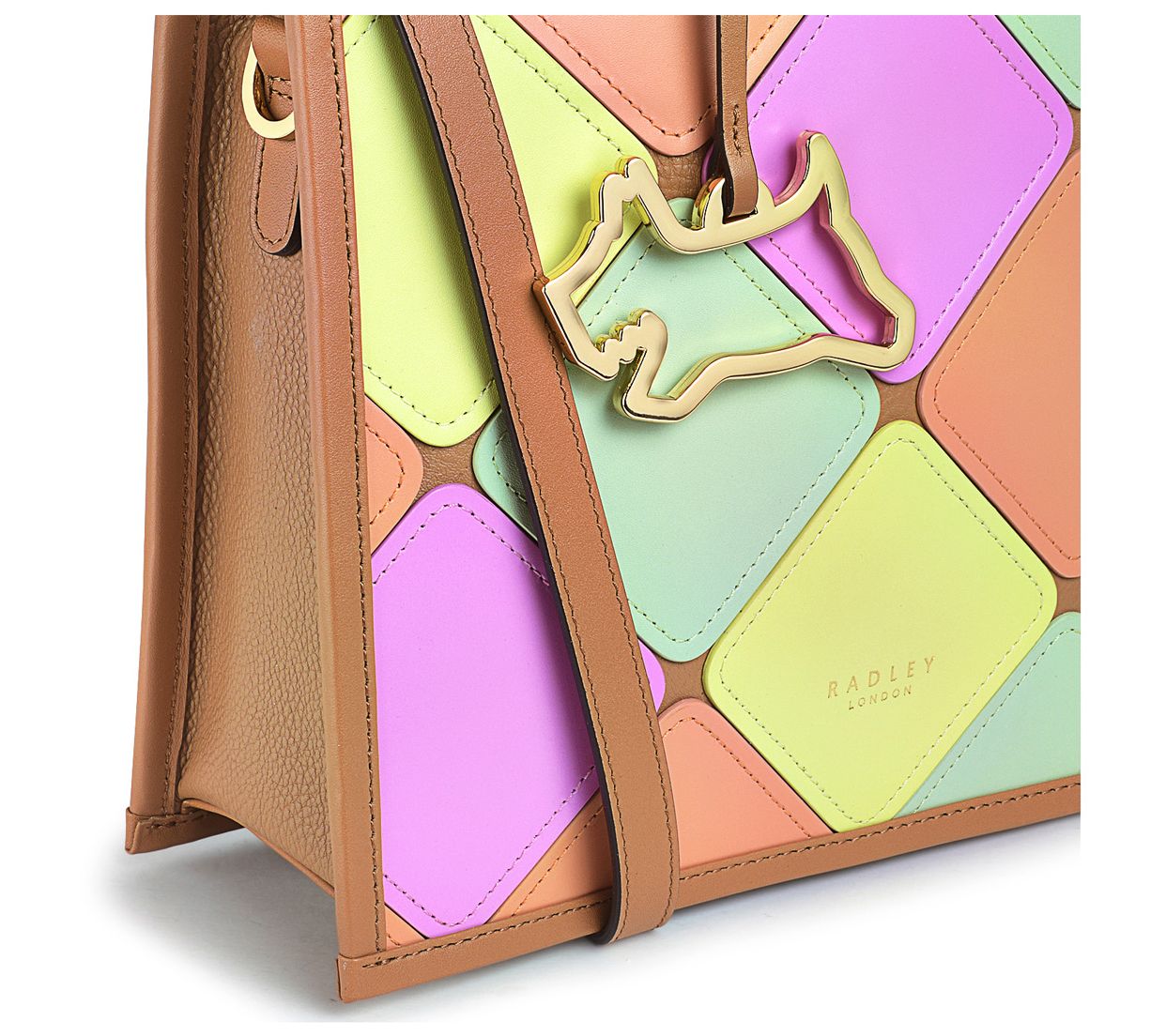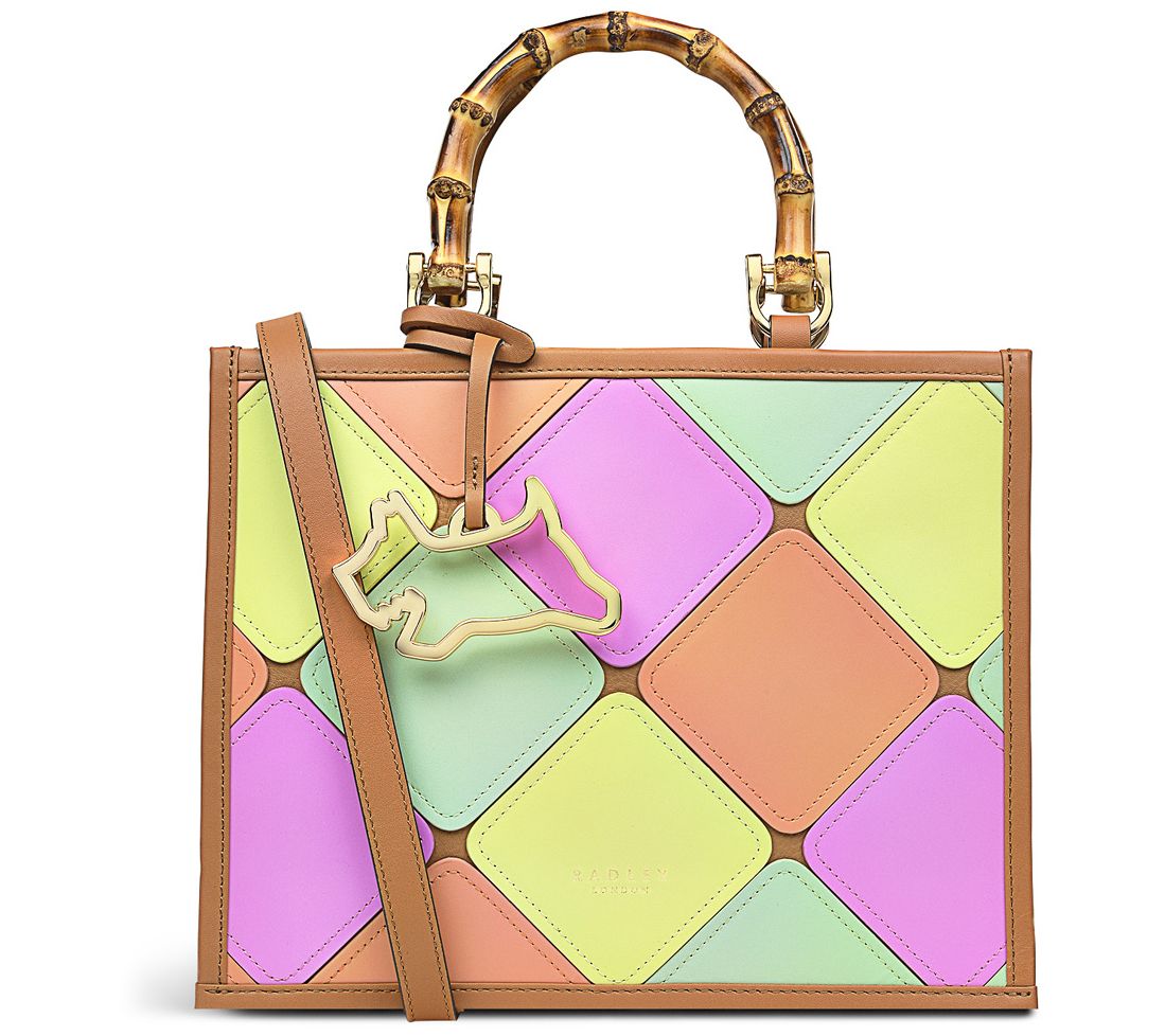 Bring pretty panache and a splash of color to your look with this cheerful patchwork handbag boasting bamboo-style handles and a pawsome Scottie dog charm. From RADLEY London.