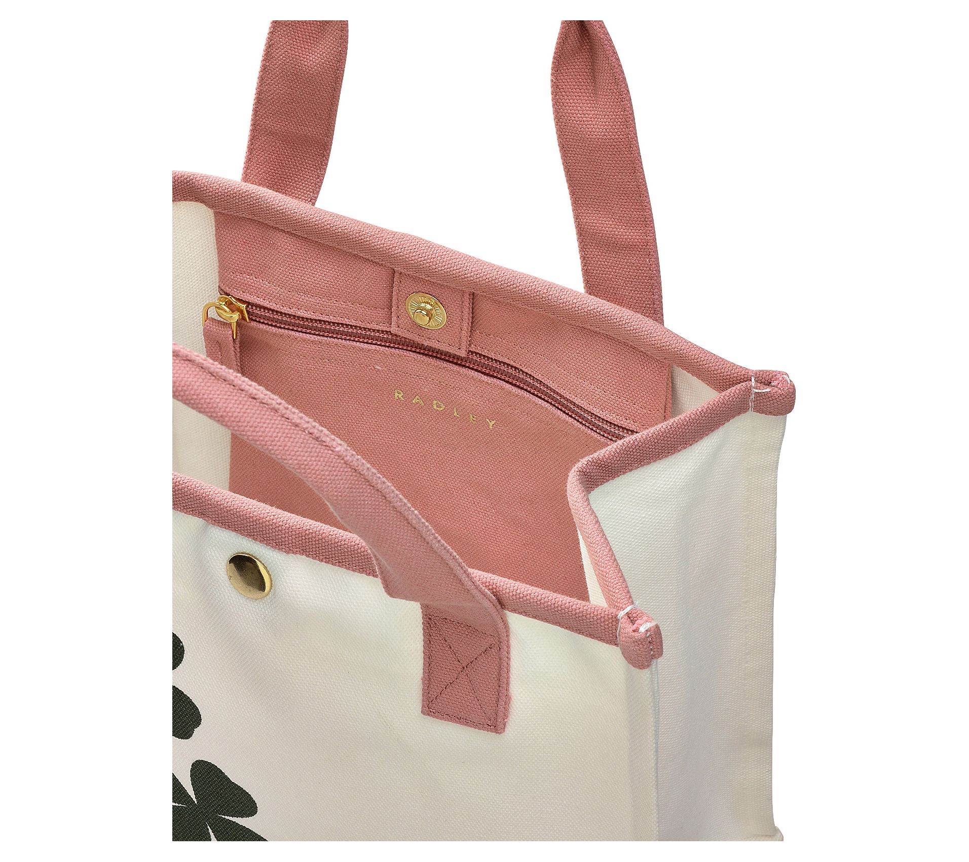 Whether it's a quick trip to the farmers' market or a casual lunch date, this tote is your stylish companion. Perfectly sized for daily essentials, it features a delightful design with vintage clovers and the iconic Scottie dog. Easy grab handles and a secure snap closure make it practical and charming. From RADLEY London.