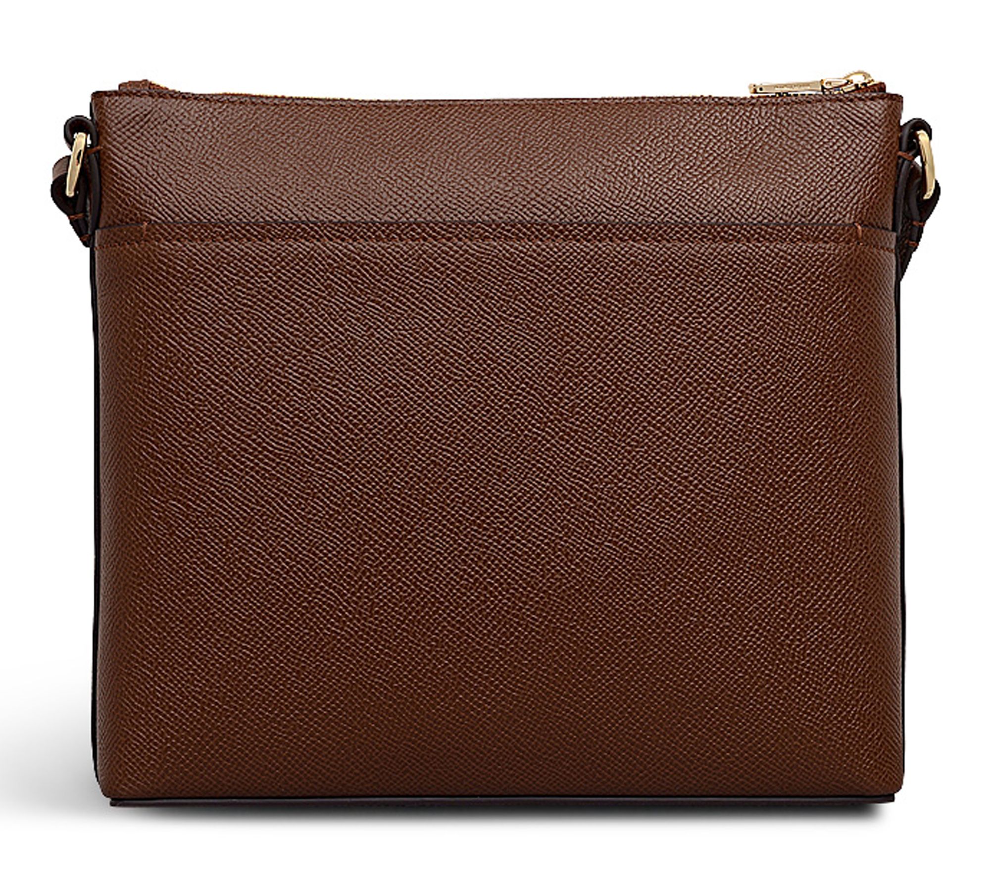 • Zip-top closure; single adjustable handle; signature curved front slip pocket; goldtone hardware; detachable branded leather tag and keyring