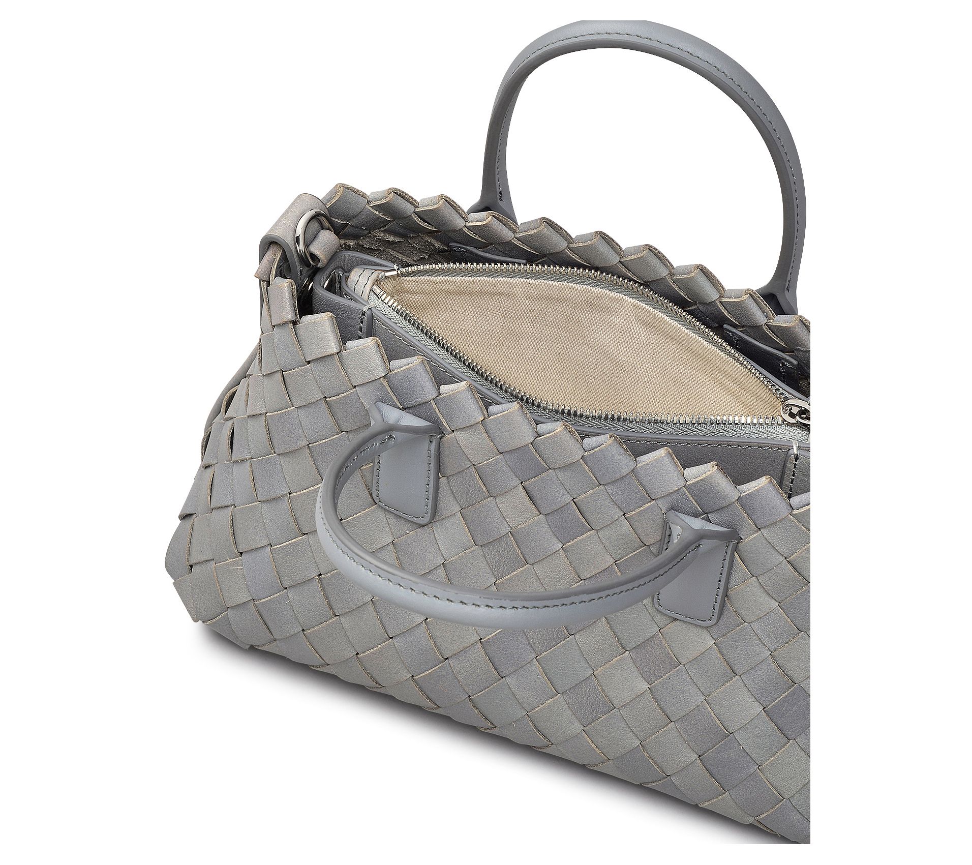 • Double handles, detachable strap, zip-top closure