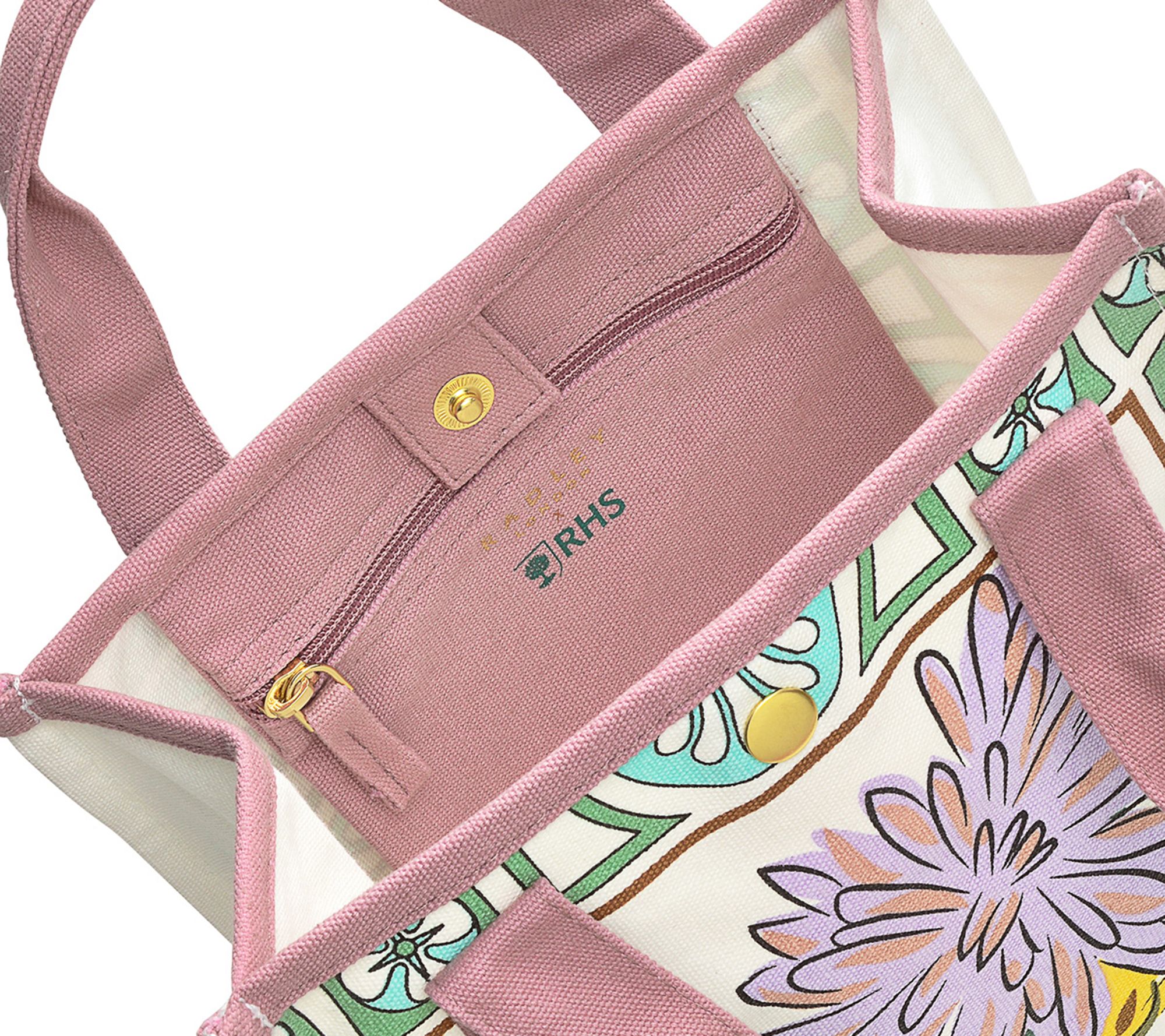 Step into spring with the RADLEY London RHS small open-top tote, a masterpiece born from a unique collaboration with the Royal Horticultural Society. This tote showcases remastered floral and tile prints from the RHS archives on a cotton canvas. Its compact design features grab handles for easy carrying and a secure press stud fastening, while the interior zip pocket keeps your essentials organized and accessible. From RADLEY London.