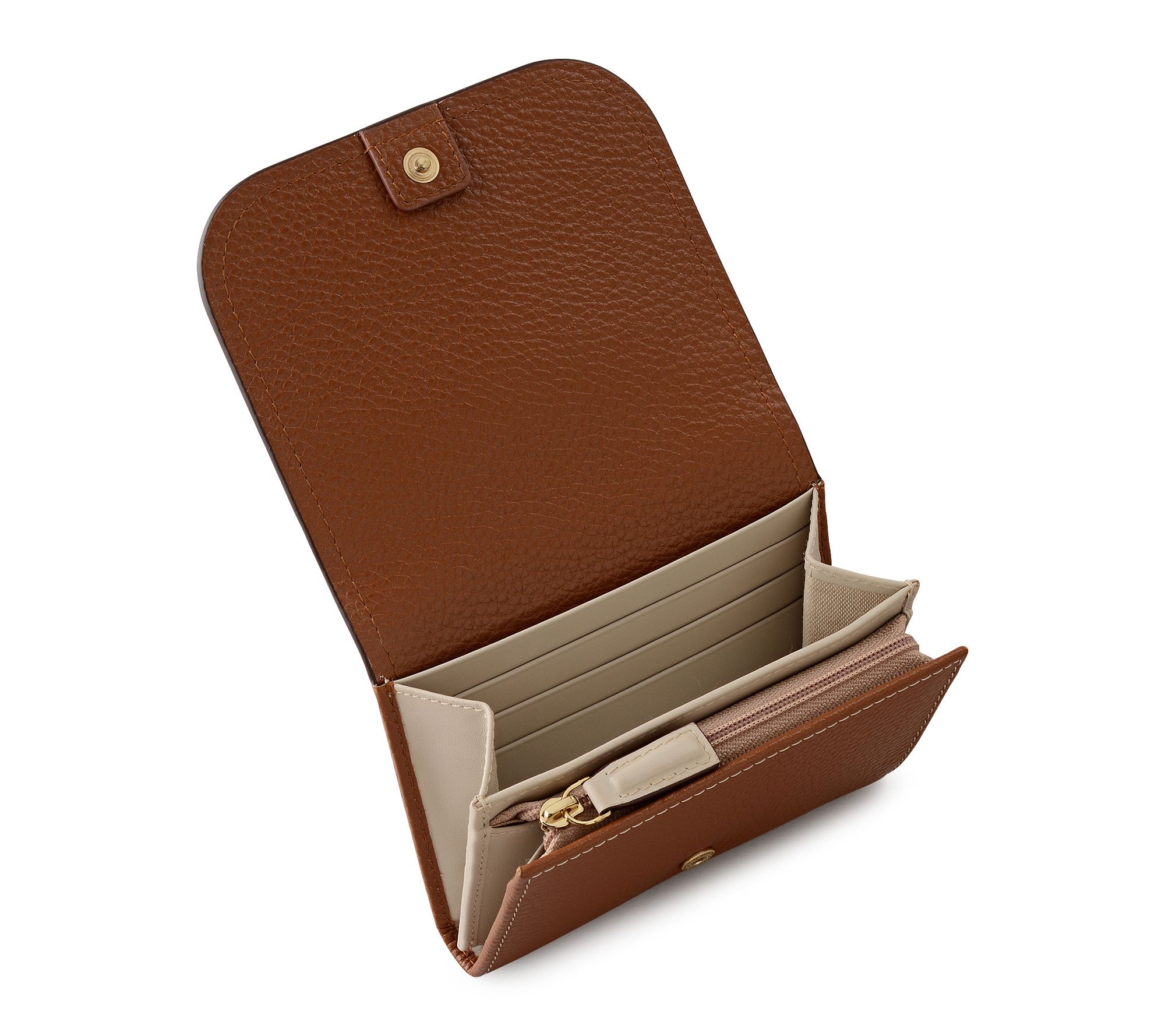• Flapover design with snap closure, multiple card slots, slip pockets, zip coin pocket