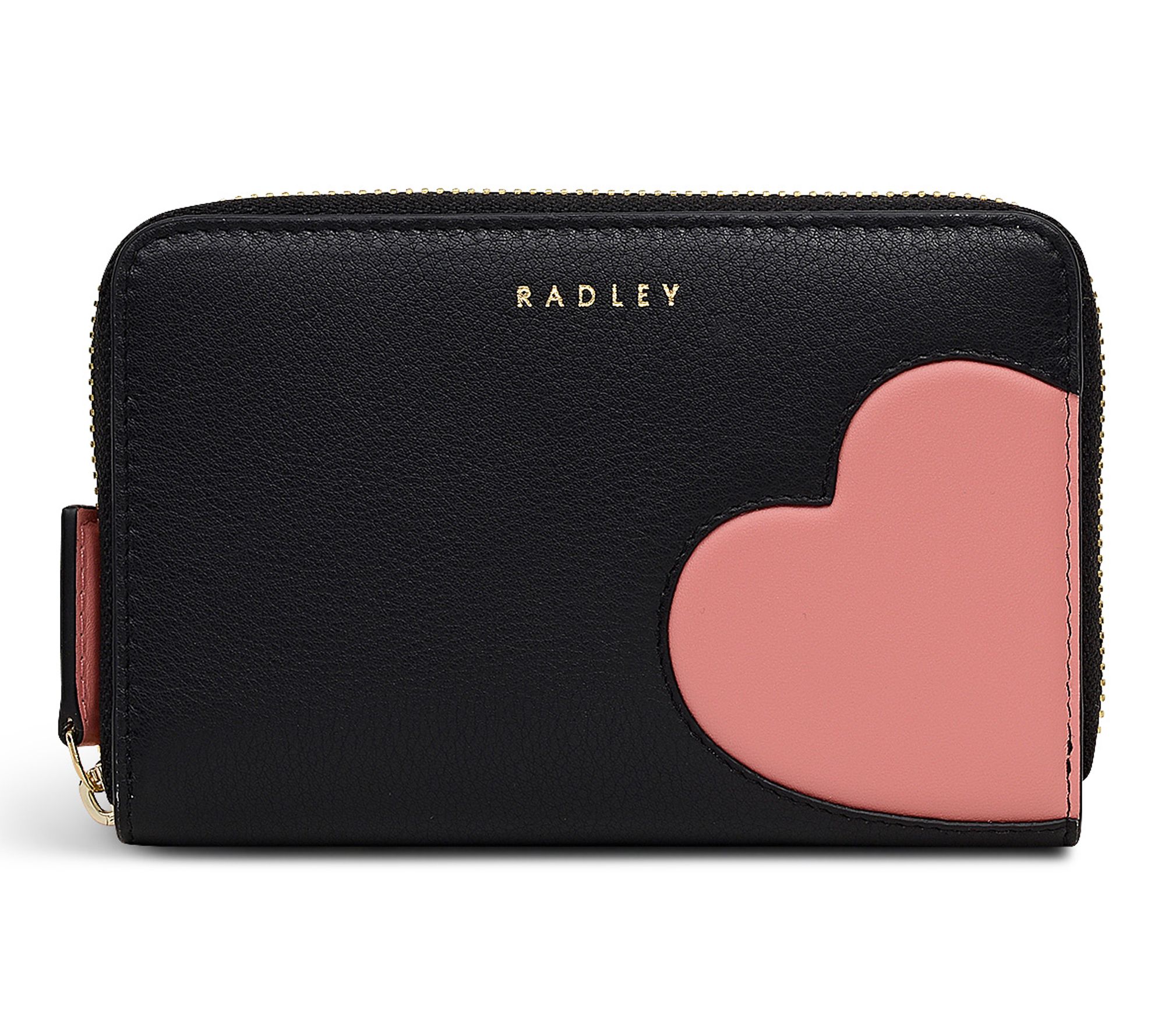 • Zip top closure; padded smooth heart detail; foil embossed logo; leather zip pullers