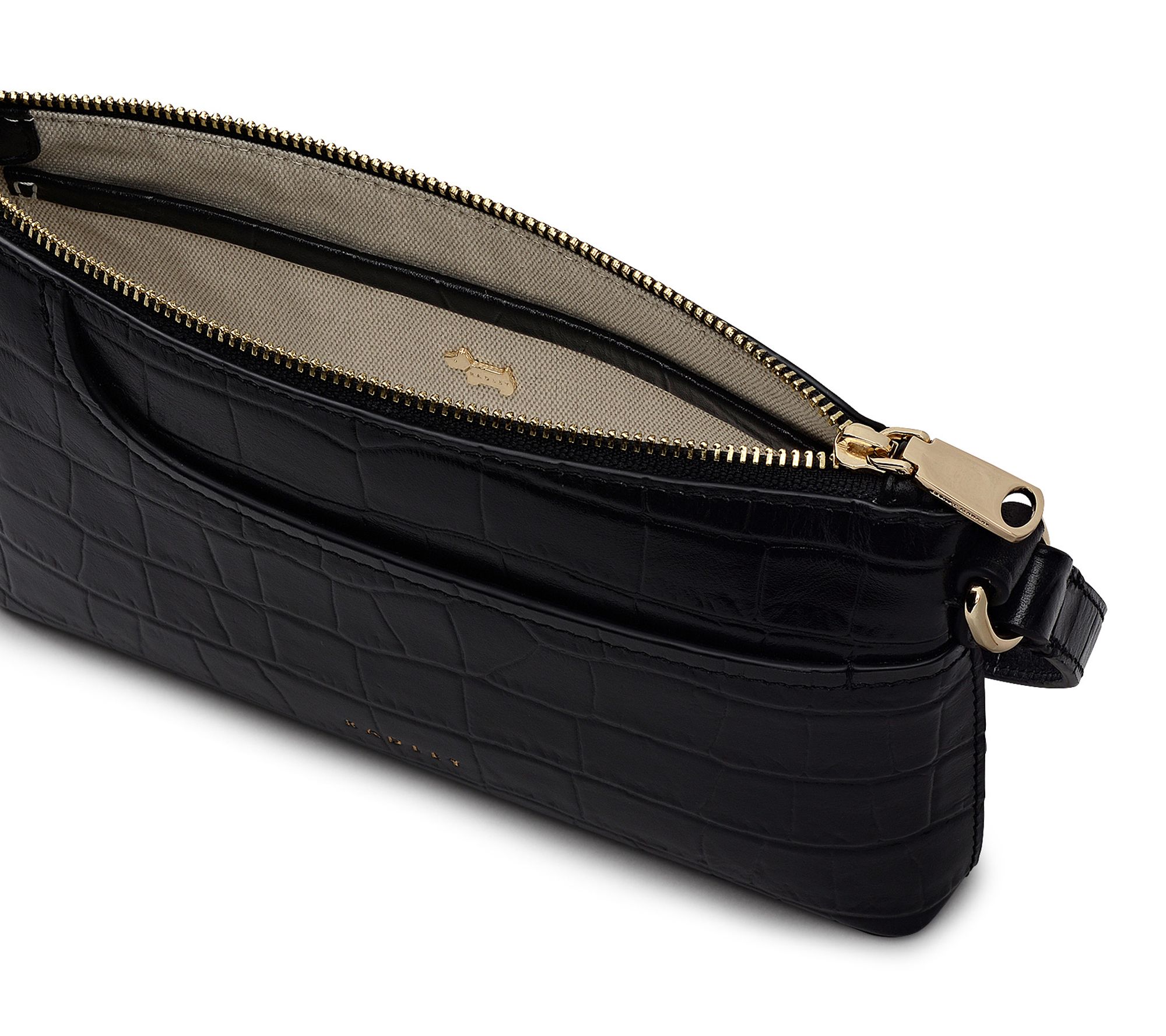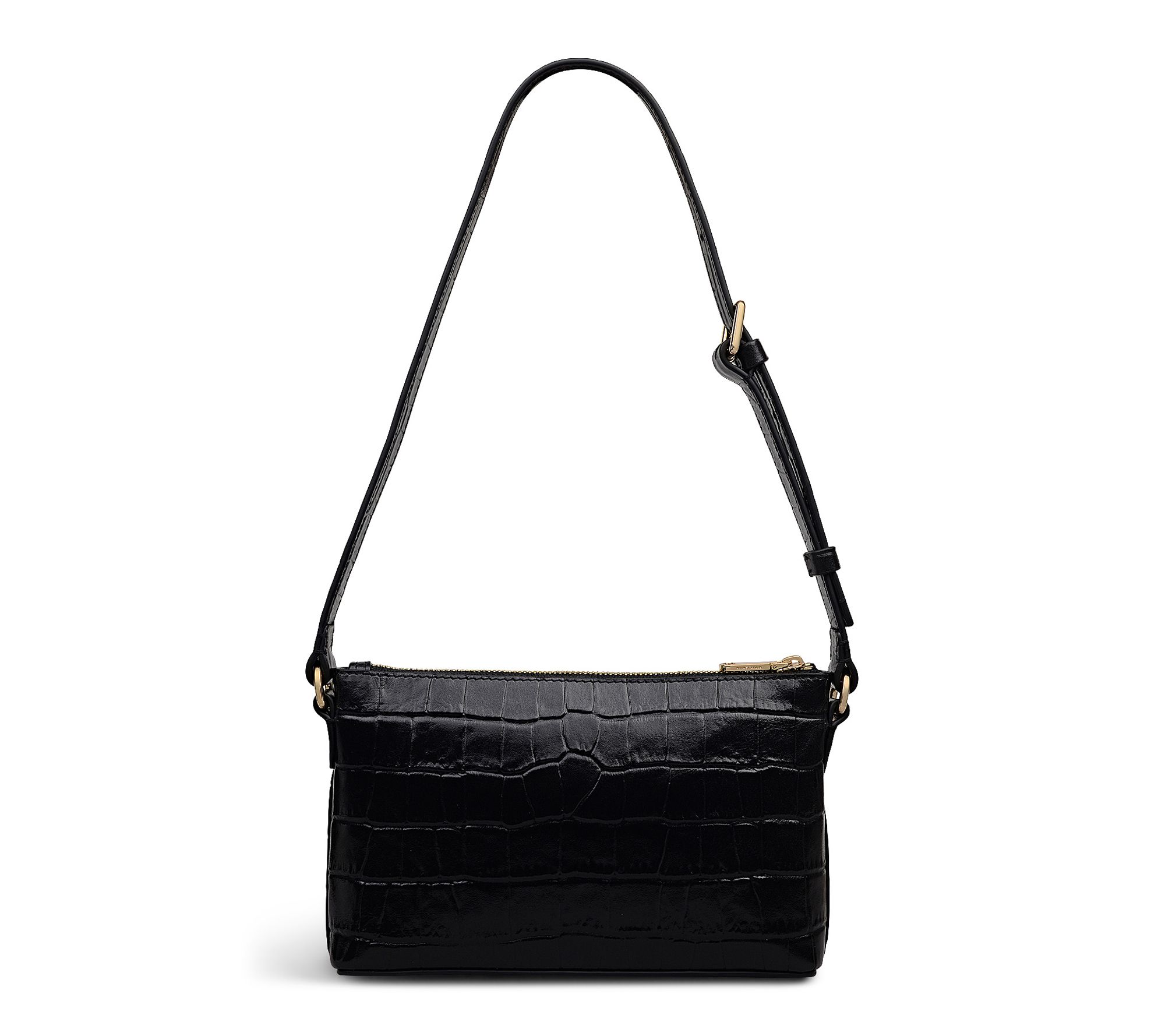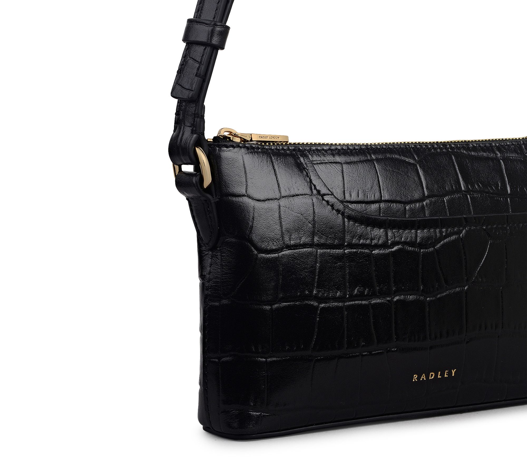 • Textured croc-embossed leather exterior with painted cut edges, signature curved front slip pocket, zip-top fastening with branded metal puller, adjustable single shoulder strap, detachable branded leather fob and keyring, foil logo