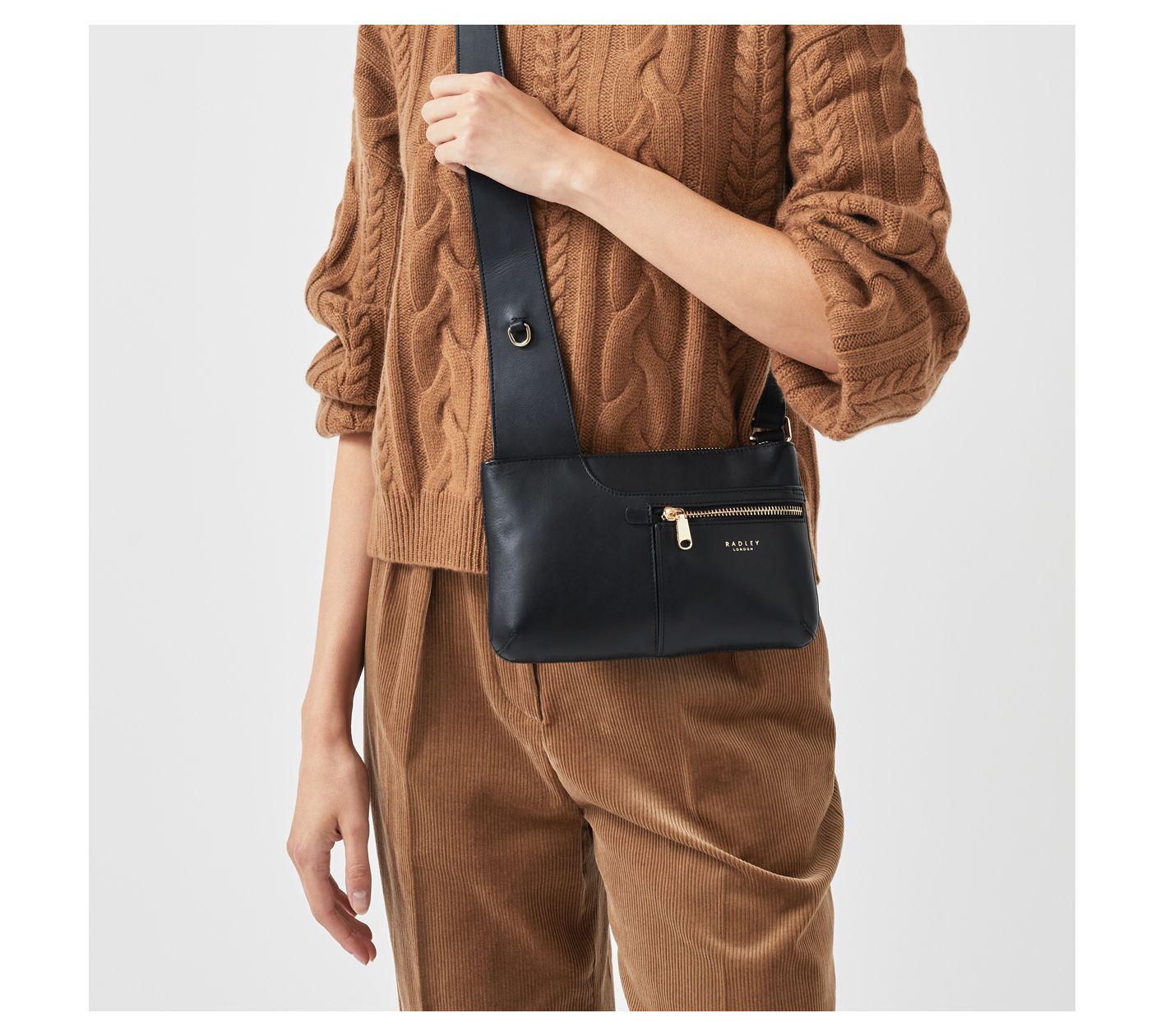 Enjoy hands-free convenience with this mini-sized crossbody bag boasting convenient pockets inside and outside and a clip-on key fob to keep you organized. From Radley.