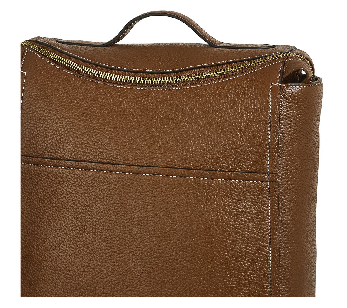 Grained leather body, backpack straps, top handle, removable crossbody strap, curved zip closure, foil logo, goldtone hardware